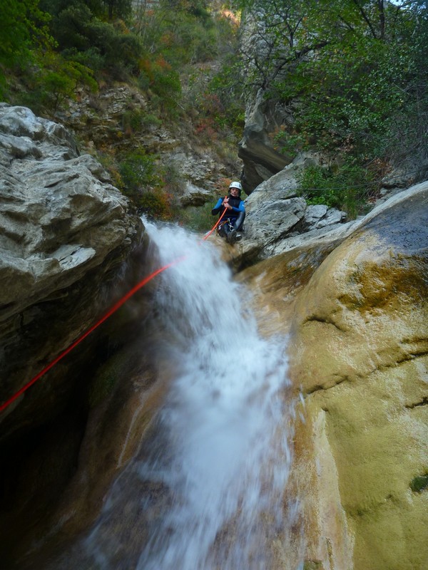 Après ça, le canyon se fait plus étroit et de nombreuses résurgences gouttent sur nos têtes, créant au passage de superbes tufs. Émerveillement garanti !Quelques sauts et rappels plus loin, le retour au soleil signifie la fin des hostilités et le départ d’une marche en rivière un peu fastidieuse avant le dernier saut du barrage et la marche de retour.