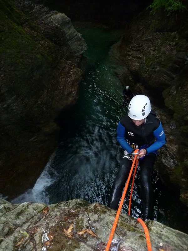 Nous voilà donc partis, petit groupe dynamique, enchainant les divers obstacles. Le canyon commence assez fort avec un très beau saut d’un pont traversant la rivière. S’ensuit une marche ponctuée de diverses petites glissades et sauts pour arriver au point fort du canyon : le grand rappel sous la cascade. Le saut est possible mais assez technique et le rappel si beau qu’il serait dommage de le manquer !