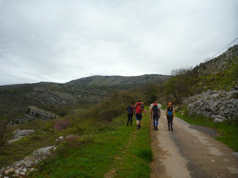Le lendemain matin, 7h30, j’ouvre les yeux sur un ciel pas complètement bouché. Je me dis : « Chouette, on va peut-être avoir un peu de soleil ce matin ! » Lorsque j’essaie de sortir du lit, mon corps me rappelle douloureusement ce que je suis allé faire la veille. Je me sens comme une mélange homogène de courbatures, bleus et autres hématomes. Mais qu’importe, aujourd’hui, c’est canyoning ! Debout vaillant soldat ! Un café, une tartine, un autre café et c’est parti pour Gourdon et son Riou au débit suffisamment intéressant seulement après de bonnes pluies. Je récupère Anaïs et Nico au passage, le temps se couvre déjà passablement. Nous arrivons en même temps que Paul et le temps d’attendre Mélissa et Christophe au café pour un petit troisième, c’est carrément une belle brume qui nous cueille (à défaut de la belle blonde). Bah, on ne s’attendait pas à un soleil radieux et puis, il ne pleut pas encore !