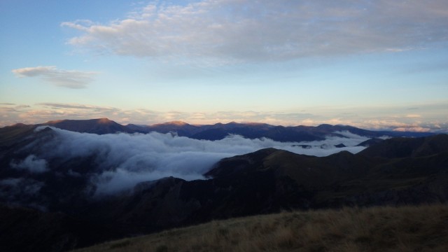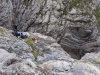 Pendant ce temps, Alex me rejoignait. Physiquement, il peine (mais on a marché vite, une heure de moins que ce que prévoit le topo). Il a fait une mauvaise glissade dans la montée et s’est fait une petite frayeur. Il m’explique qu’il a les jambes en coton et ce qu’il voit derrière la crête n’est pas là pour le rassurer. Il commence à douter. Après quelques minutes de repos et un Twix, le soleil pointe le bout de son nez. On en profite quelques secondes car on sait que plus bas, on ne le reverra pas de si peu. Il rassure Alex et j’essaie d’en faire autant. Il n’est pas à l’aise, a peur de nous retarder. Je lui explique que nous sommes largement dans les temps, que devant, ce sont des machines, que la descente qui nous attend est plus impressionnante que difficile et que ce sera le plus dur à passer pour lui parce qu’après, dans le canyon, on retrouvera un environnement plus familier. Je fais mouche. On commence la descente vers les autres, patiemment installés sur une vire et se préparant à l’assaut. Ça prend le temps qu’il faut, mais nous les rejoignons finalement. Nous sommes sur la même base de temps que le topo. Tout va bien.