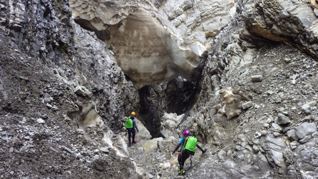 Dès lors, il ne nous reste plus que des cascades faciles. Si on fait gaffe aux frottements et à nos installations, on ne devrait pas avoir de problème. On passe sous un énorme névé écroulé en son milieu. Dessous, dessus, dessous. Il dégouline, il est suffisamment fissuré pour y voir le jour au travers. On sent qu’il ne va pas tarder à s’affaisser alors on ne traine pas dessous, malgré la majesté du lieu. La météo tourne un peu. Le soleil joue à cache-cache (ceux qui ne l’on pas reçu sur la crête ne l’ont pas vu depuis la veille !), on se prend quelques gouttes de temps en temps et les sommets se sont couverts de brume. Rien d’orageux cependant. Mais on ne prend pas le temps de regarder les petites fleurs. Surtout Yannick qui file devant dans cette partie que l’on appelle le glacier noir. Il installe sa corde, descend, attend le suivant, récupère son kit et avance jusqu’à la cascade suivante. Ainsi de suite. Comme à son habitude, il ne fait pas dans la finesse alors je dois souvent reprendre son installation pour optimiser la sécurité. Tout le monde est au point, mais avec la fatigue qui s’accumule, une erreur est vite arrivée. On perd un peu du temps, et ceux à l’arrière ne font qu’enkiter les cordes, tâche peu valorisante. Enfin le soleil atteint le fond du vallon, nous en profitons pour faire une pause, manger une bonne partie de ce que nous transportons dans les bidons, et debriefer sur notre organisation qui ne convient pas. Il est tout juste 13h, et nous sommes déjà au début de la partie médiane. La météo est correcte, nous sommes en avance sur le planning (3h contre 5h topo dans la partie amont). Ce qu’il nous reste à faire est donné en 3h. Je nous l’estime à 1h30 (et avec justesse).