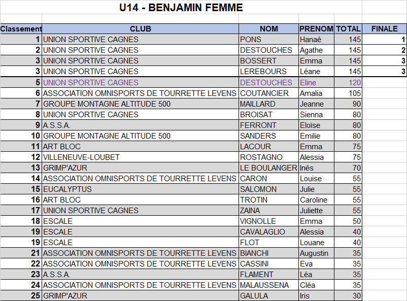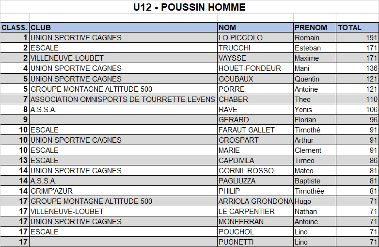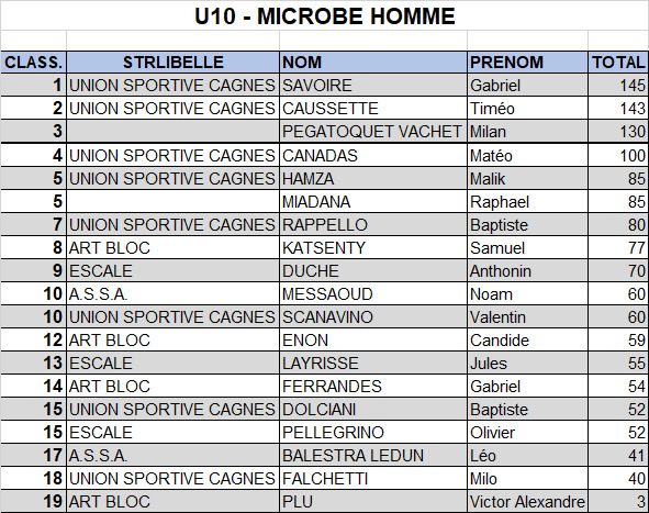 Pour les poussins, on a eu droit à un beau combat pour la deuxième place dans le bloc n°36, un bloc bien physique où Esteban a enflammé la foule avec un dernier essai « a muerte » où il tombe à la dernière prise ! Ce qui n’a pas été suffisant pour le départager de son concurrent direct : exæquo et un belle place sur le podium. Plus loin dans le classement, Timothée et Clément rentrent tout juste dans le top 10 avec une belle 10ème place exæquo. Timéo est juste derrière avec la 13ème place tandis que Lino prend la 17ème place. Bravo les garçons.