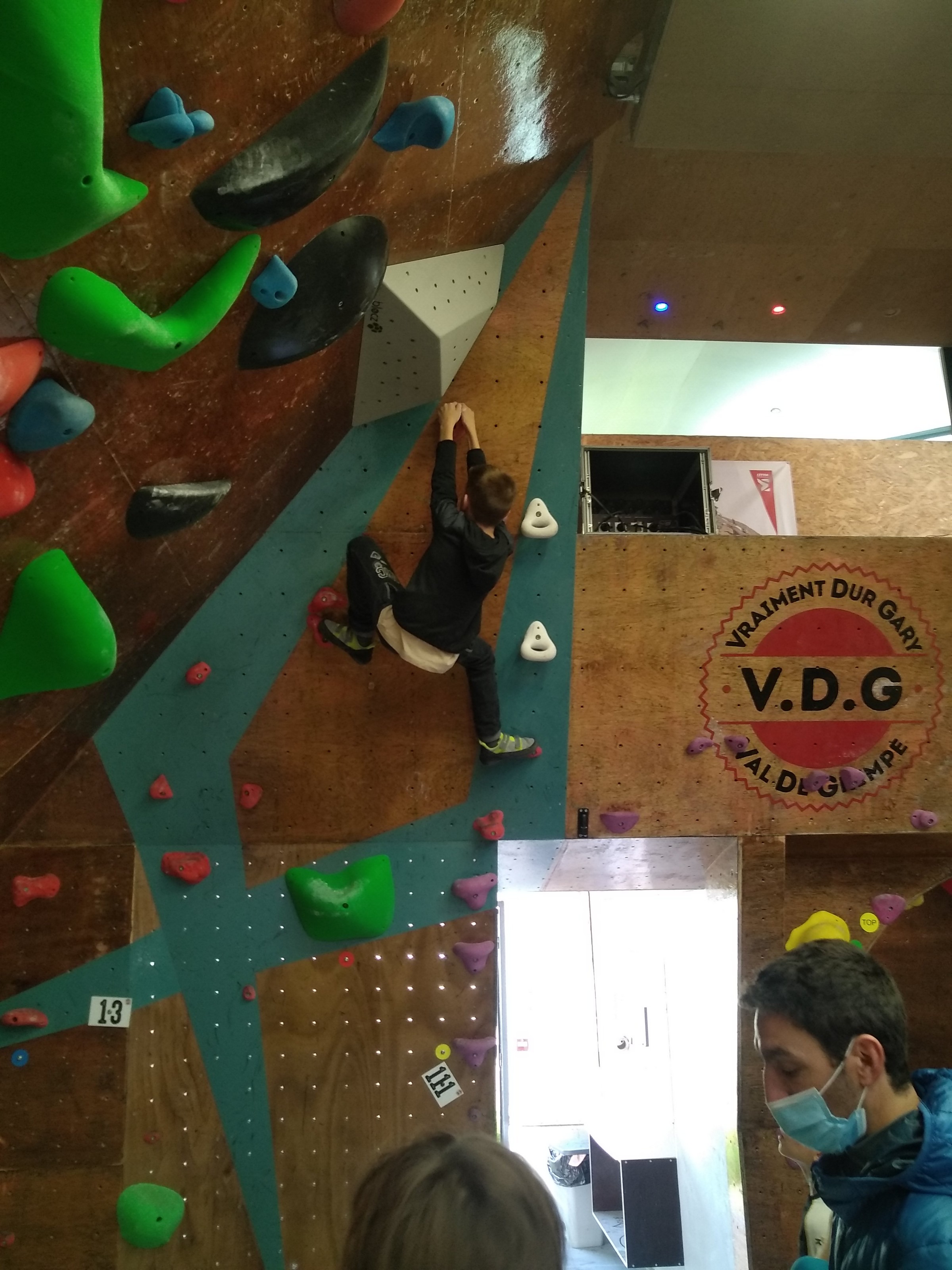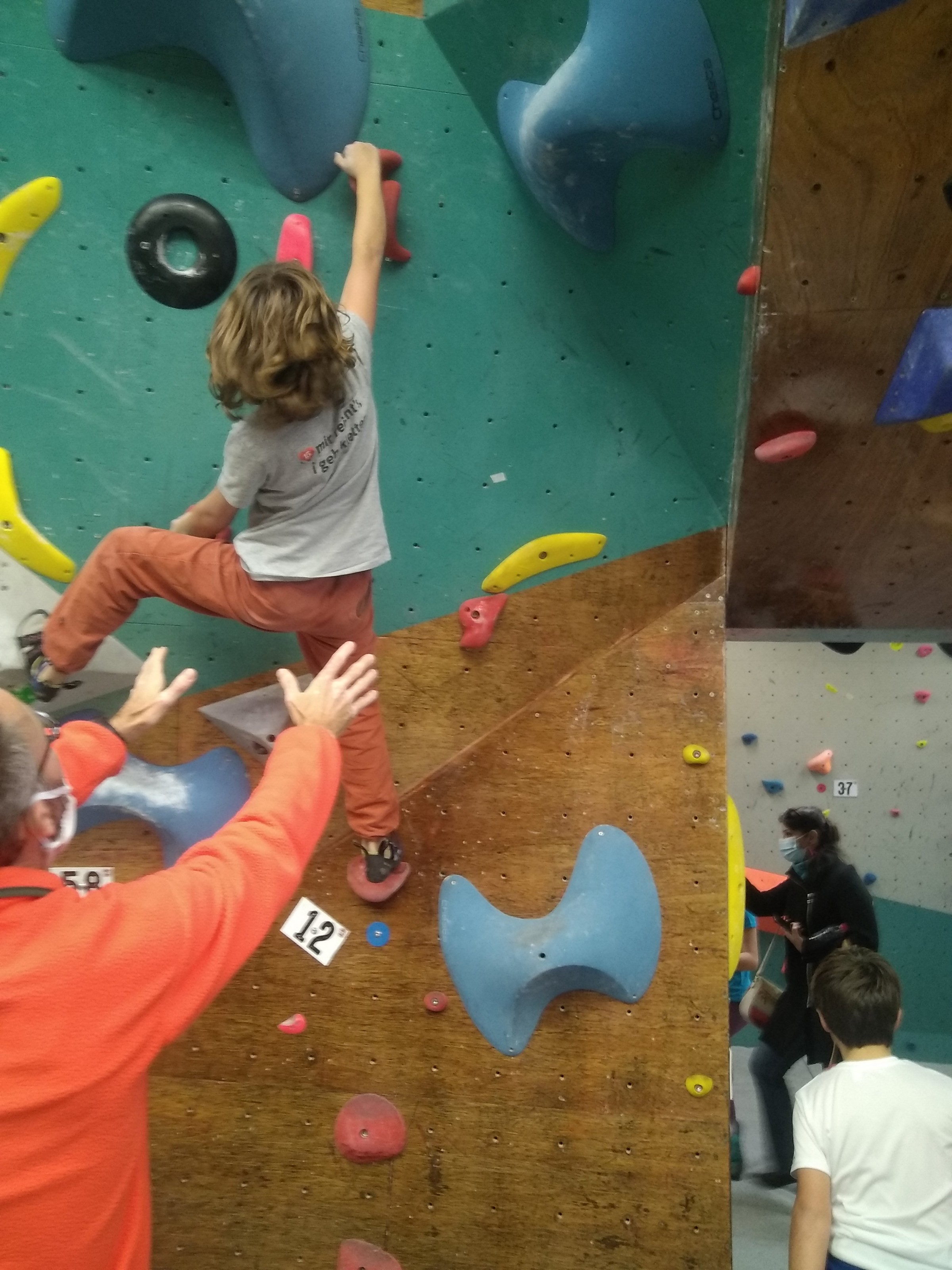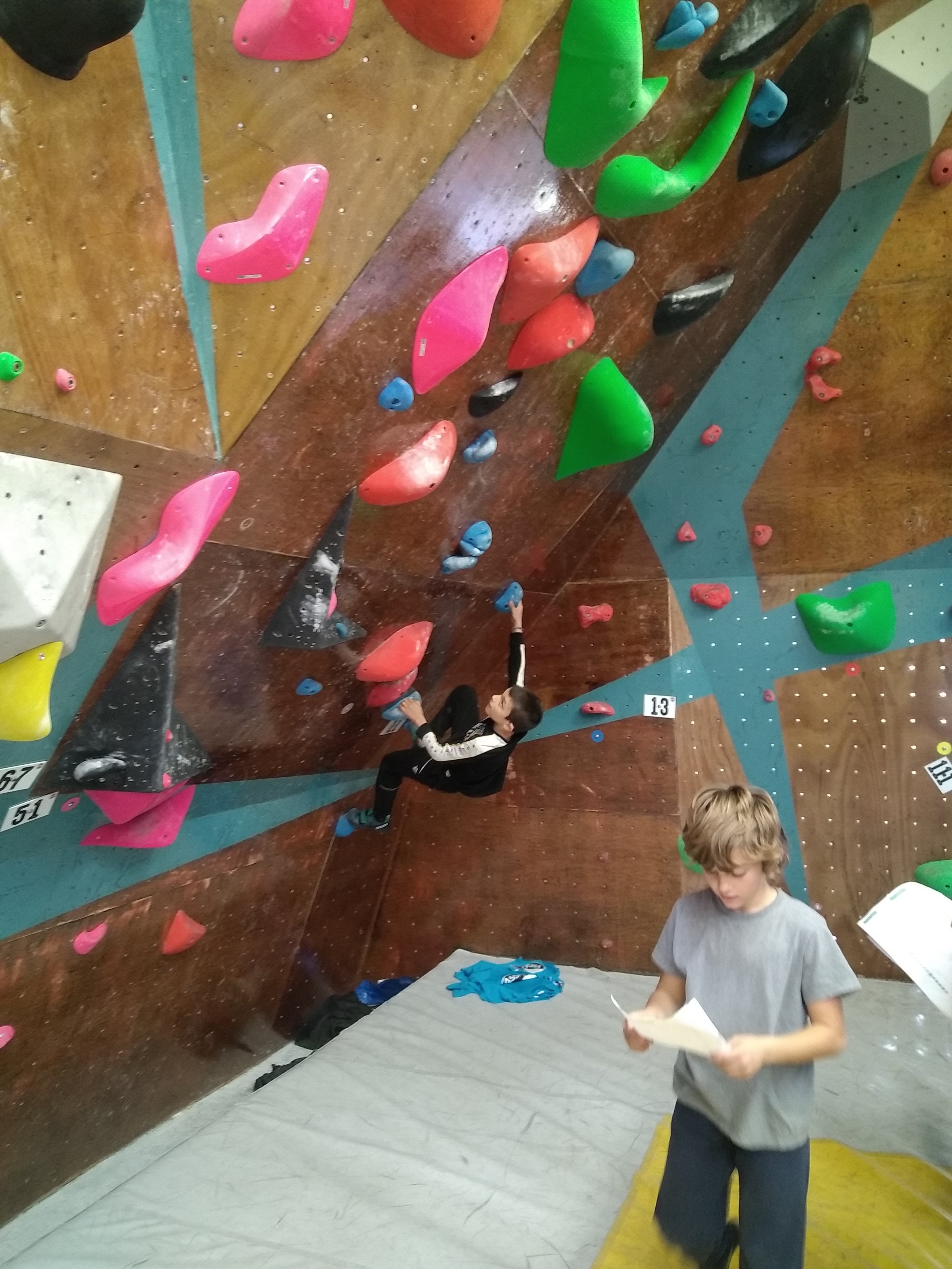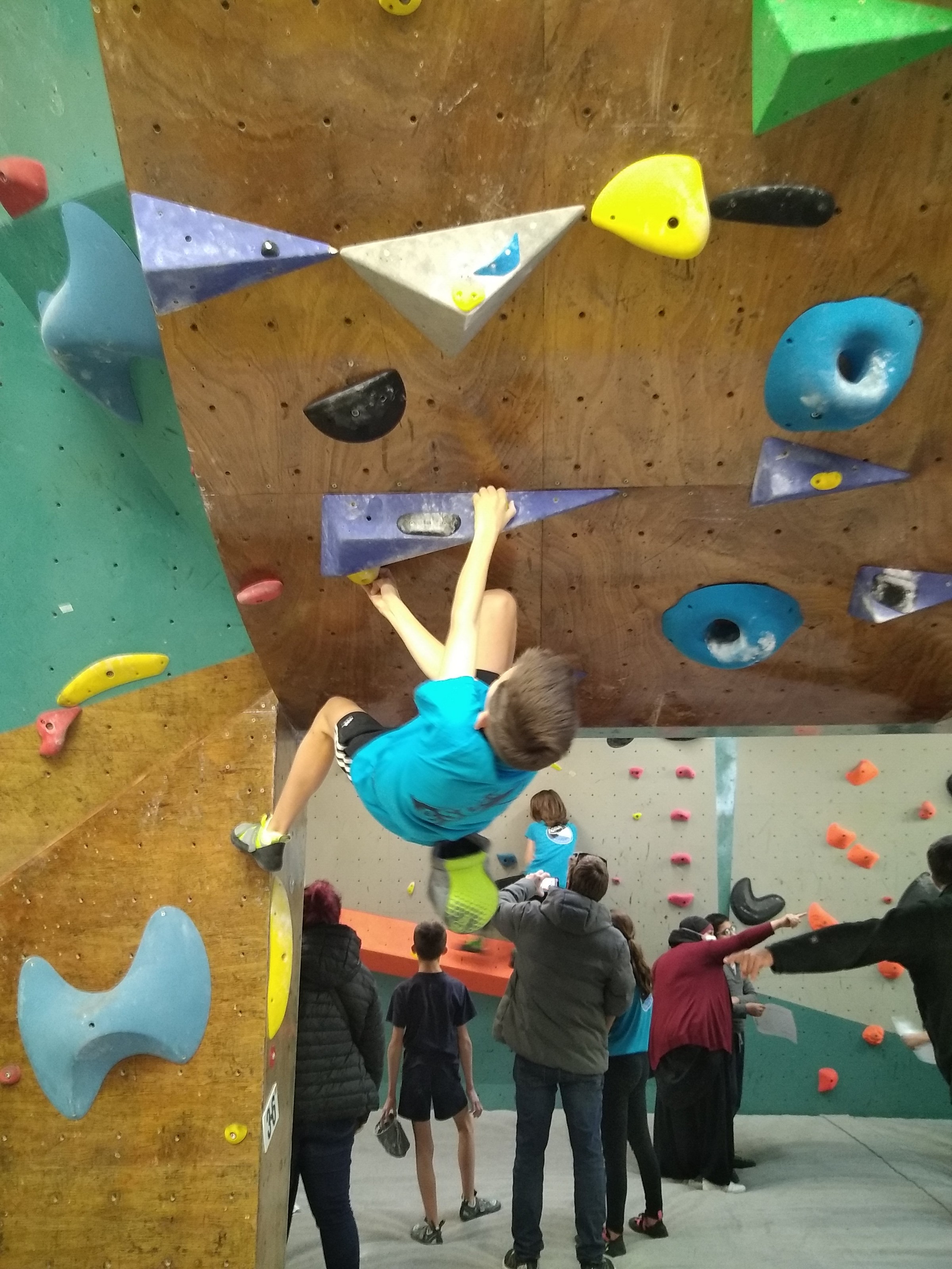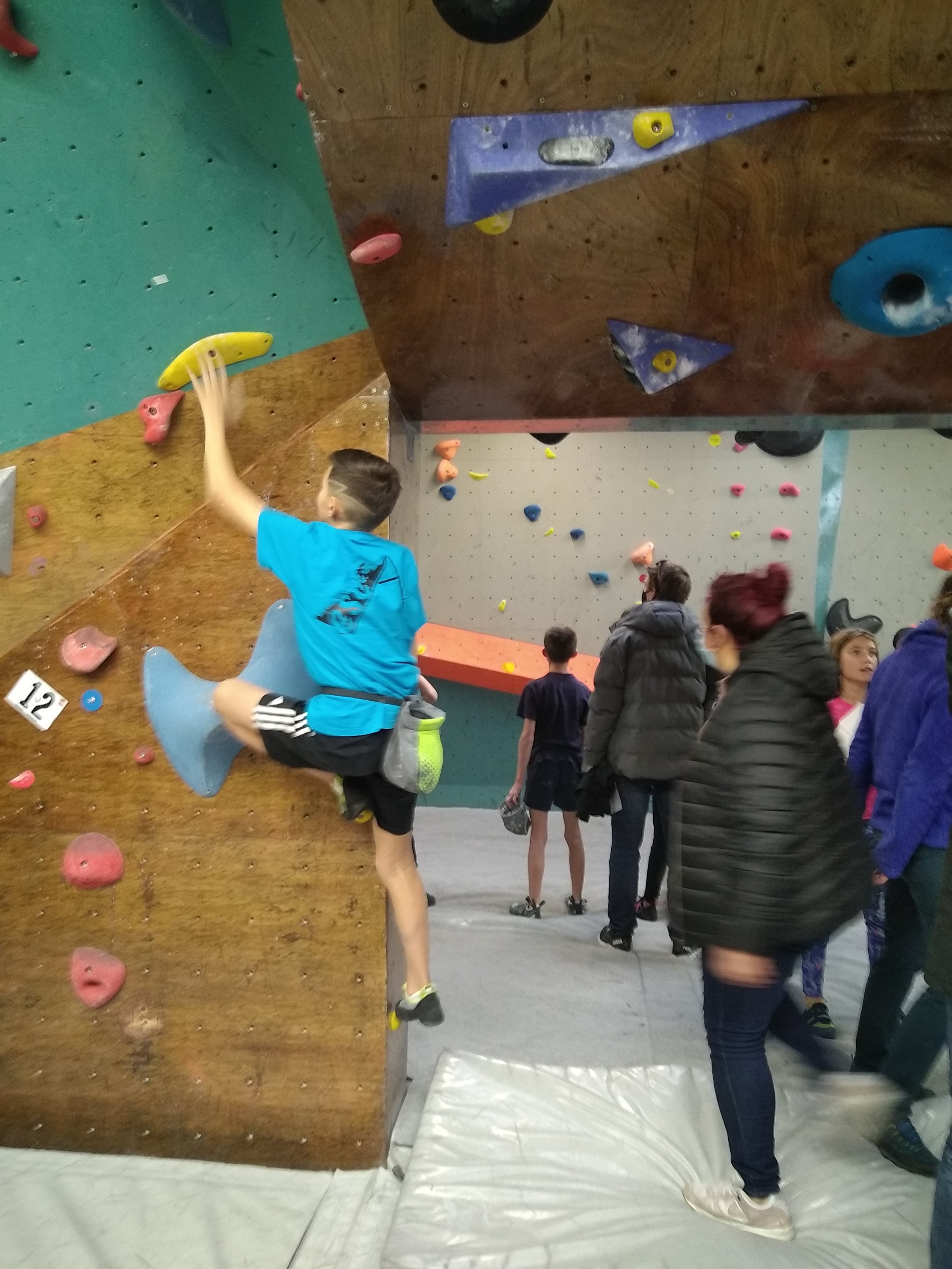 Je suis donc arrivé vers 8h45 à la salle pour accueillir les plus petits dans un froid bien local. Très vite, nous nous sommes rendus compte que ça allait être une vague difficile (pas de mauvais jeu de mot). J’ai entendu parler de 75 enfants. Il a donc fallu réunir tout le monde, trouver des parents pour juger, expliquer aux autres qu’il ne fallait pas rester dans la salle, finaliser les inscriptions, corriger les fiches qui n’ont pas été imprimées en assez grand nombre… C’était un peu la pagaille en tout début de contest mais ça s’est réorganisé. Une fois surtout que les petits ont compris le principe de la compétition, repéré les blocs et les juges. Pas facile à cet âge-là !