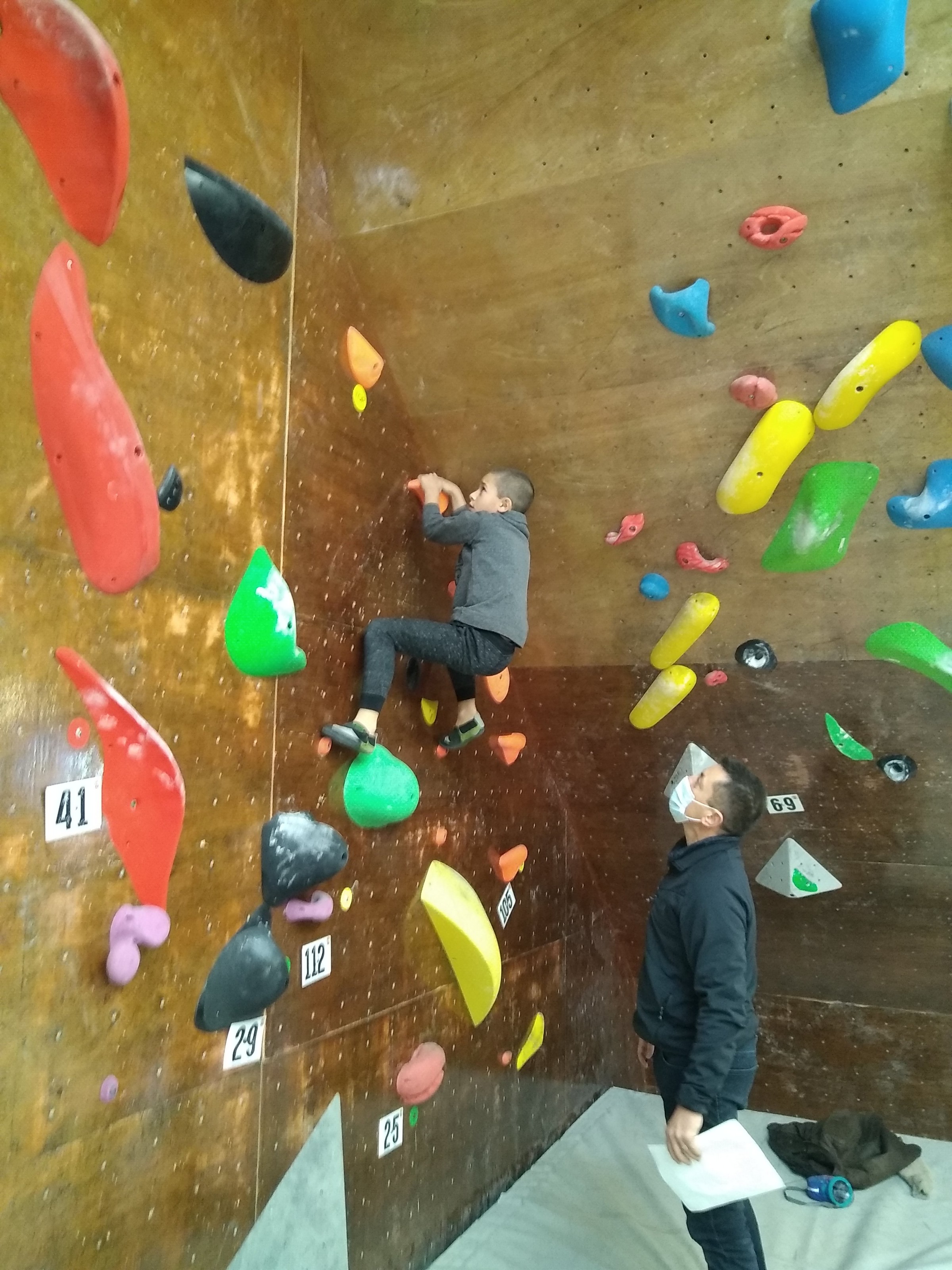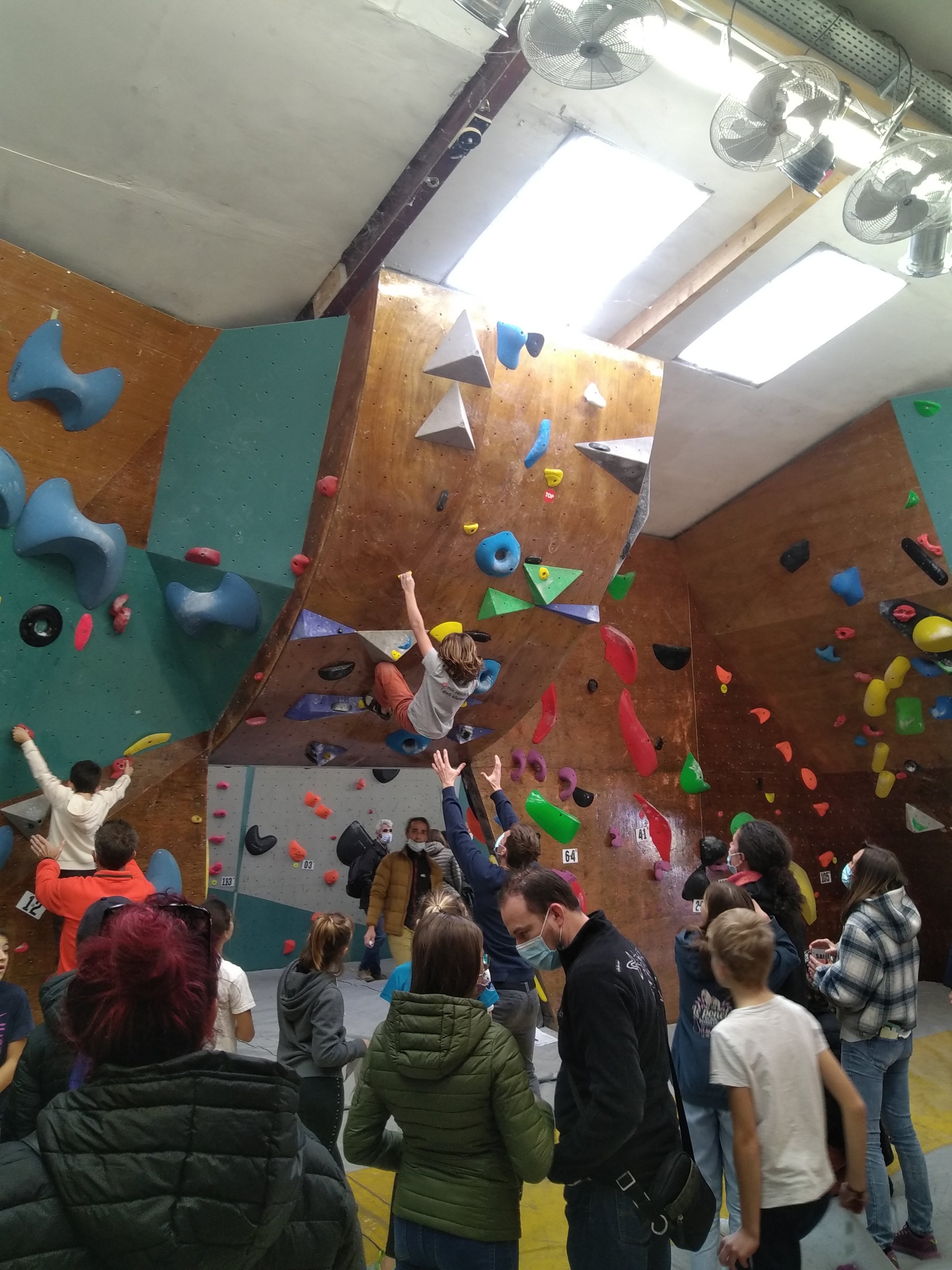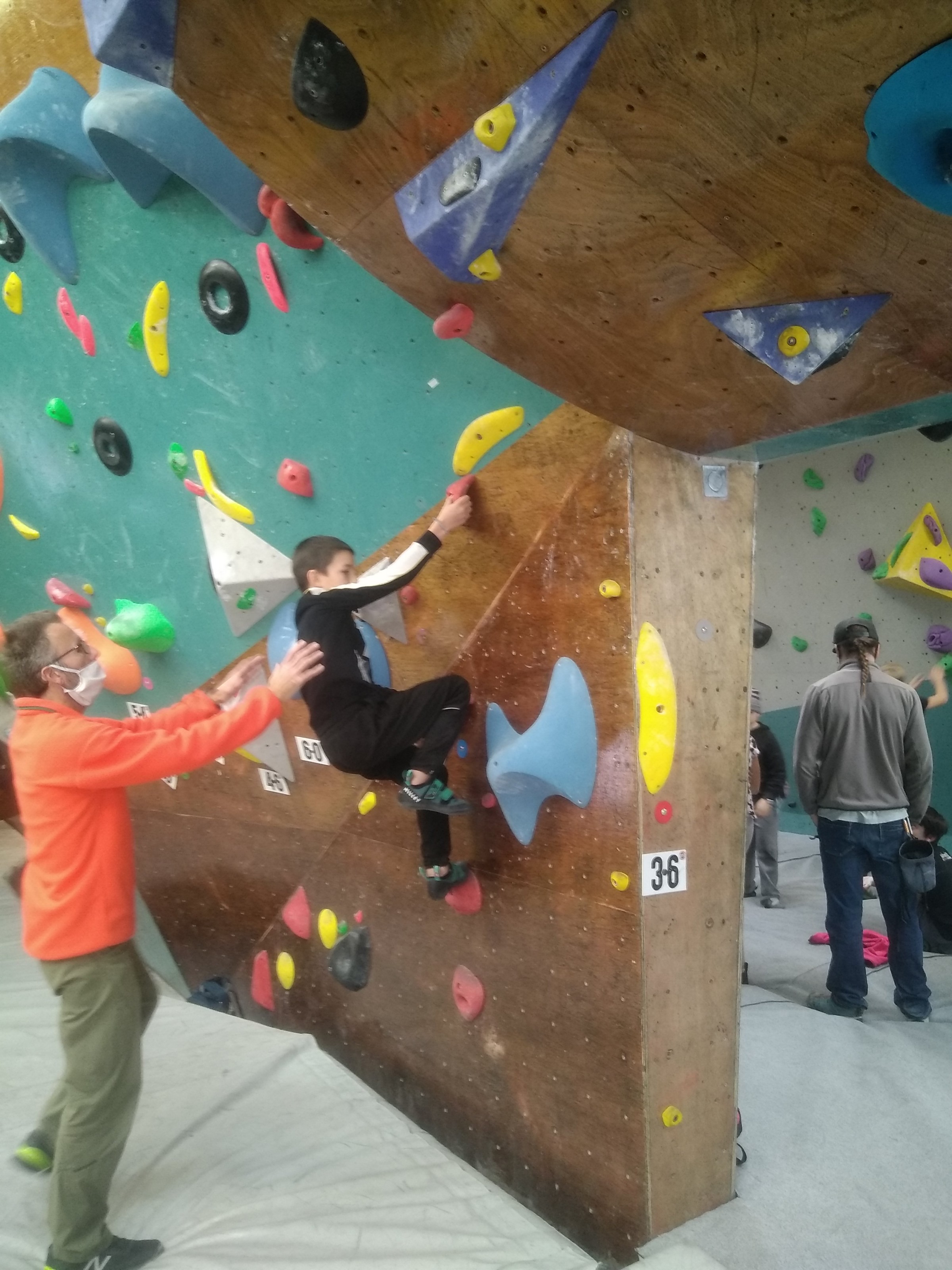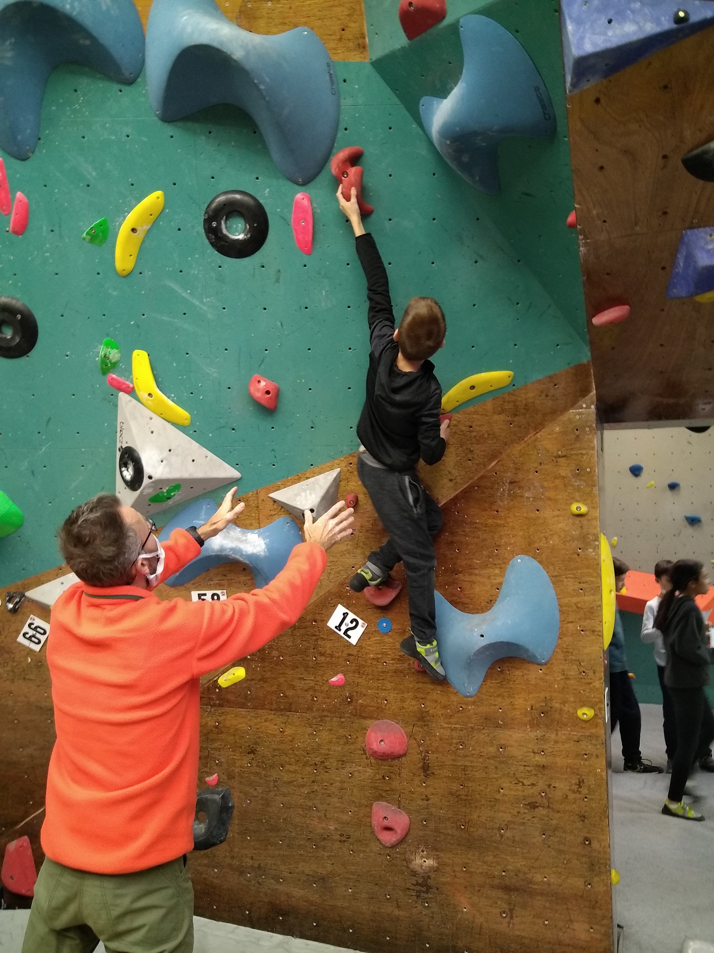 Je suis donc arrivé vers 8h45 à la salle pour accueillir les plus petits dans un froid bien local. Très vite, nous nous sommes rendus compte que ça allait être une vague difficile (pas de mauvais jeu de mot). J’ai entendu parler de 75 enfants. Il a donc fallu réunir tout le monde, trouver des parents pour juger, expliquer aux autres qu’il ne fallait pas rester dans la salle, finaliser les inscriptions, corriger les fiches qui n’ont pas été imprimées en assez grand nombre… C’était un peu la pagaille en tout début de contest mais ça s’est réorganisé. Une fois surtout que les petits ont compris le principe de la compétition, repéré les blocs et les juges. Pas facile à cet âge-là !