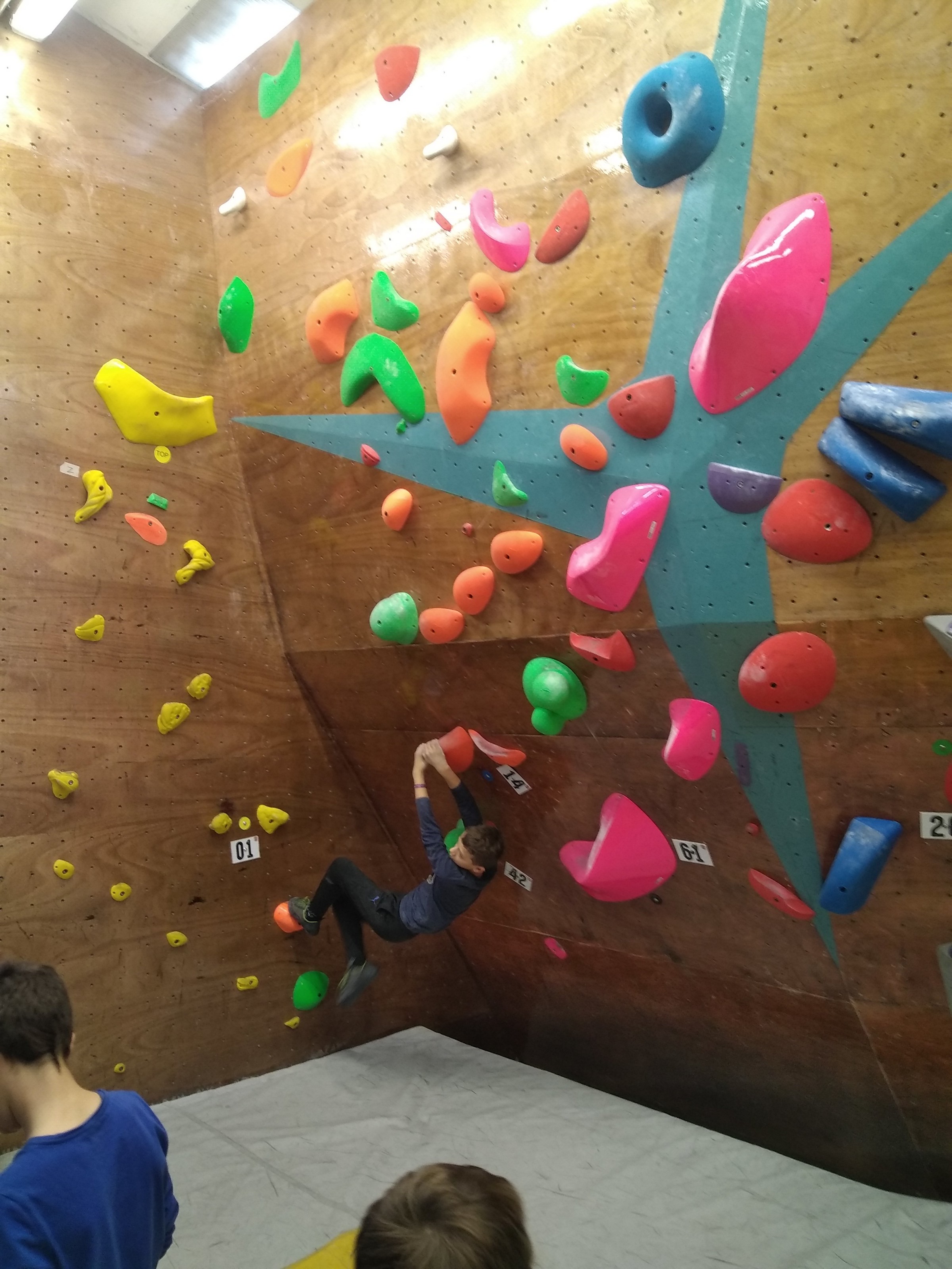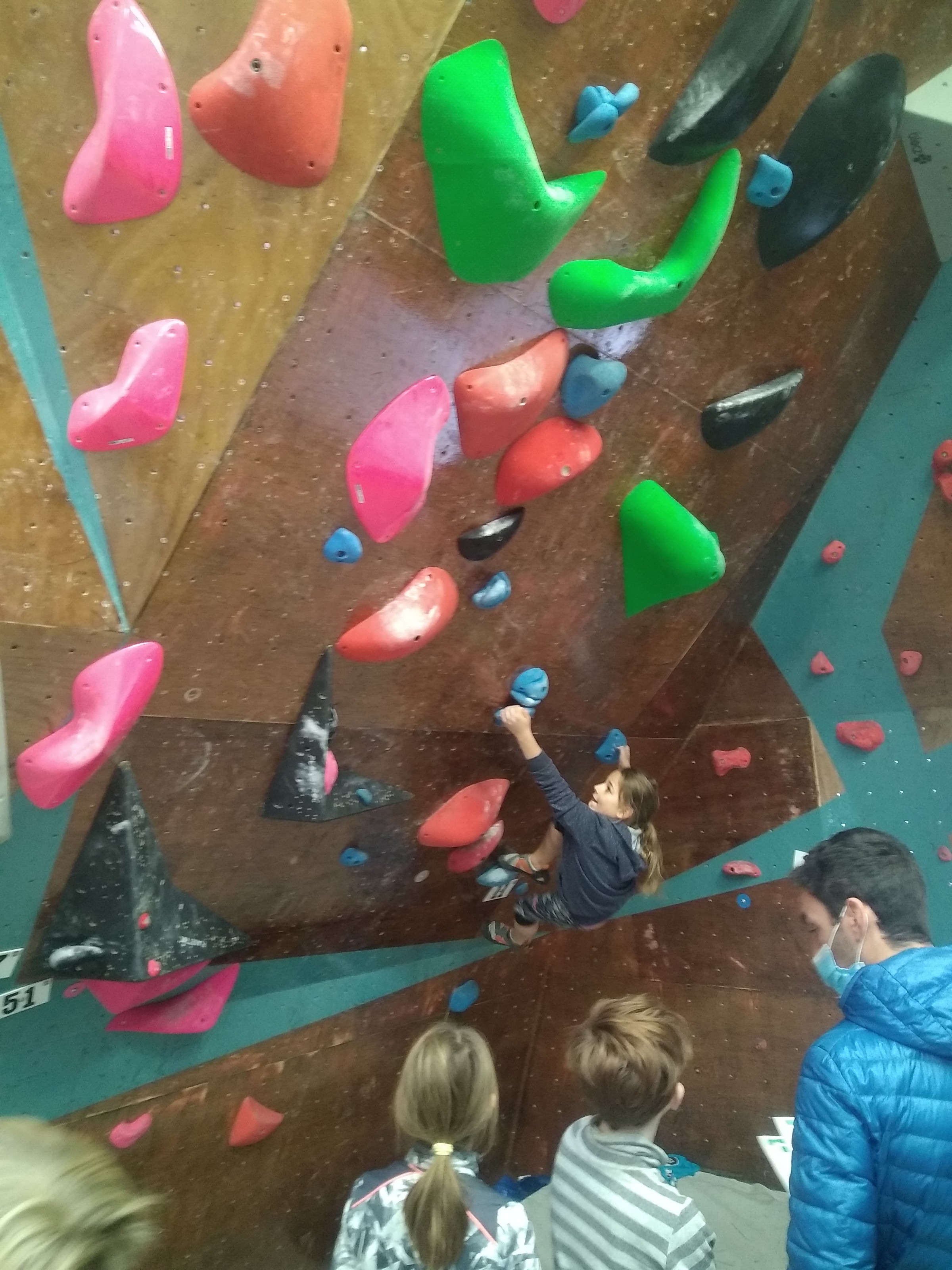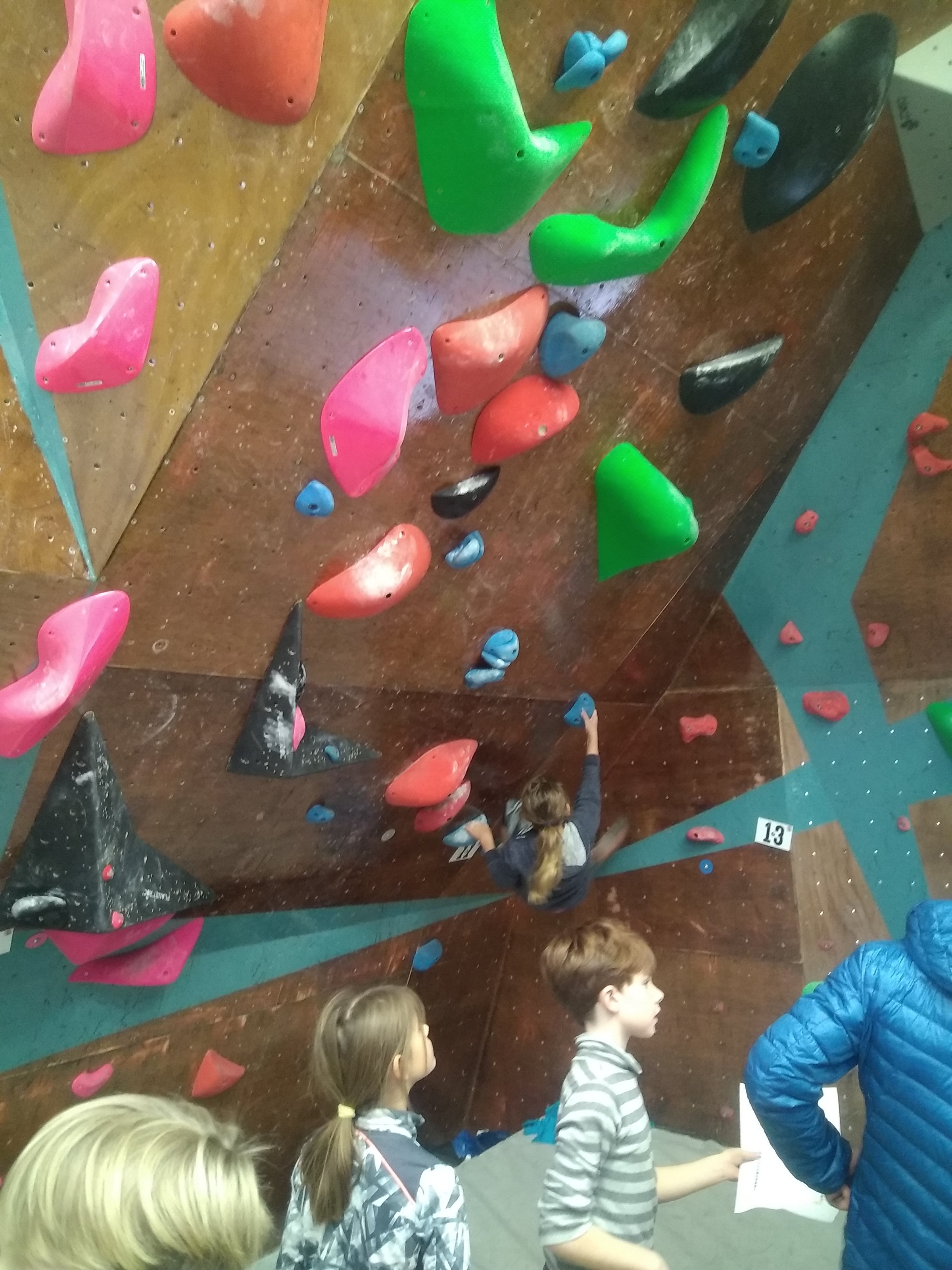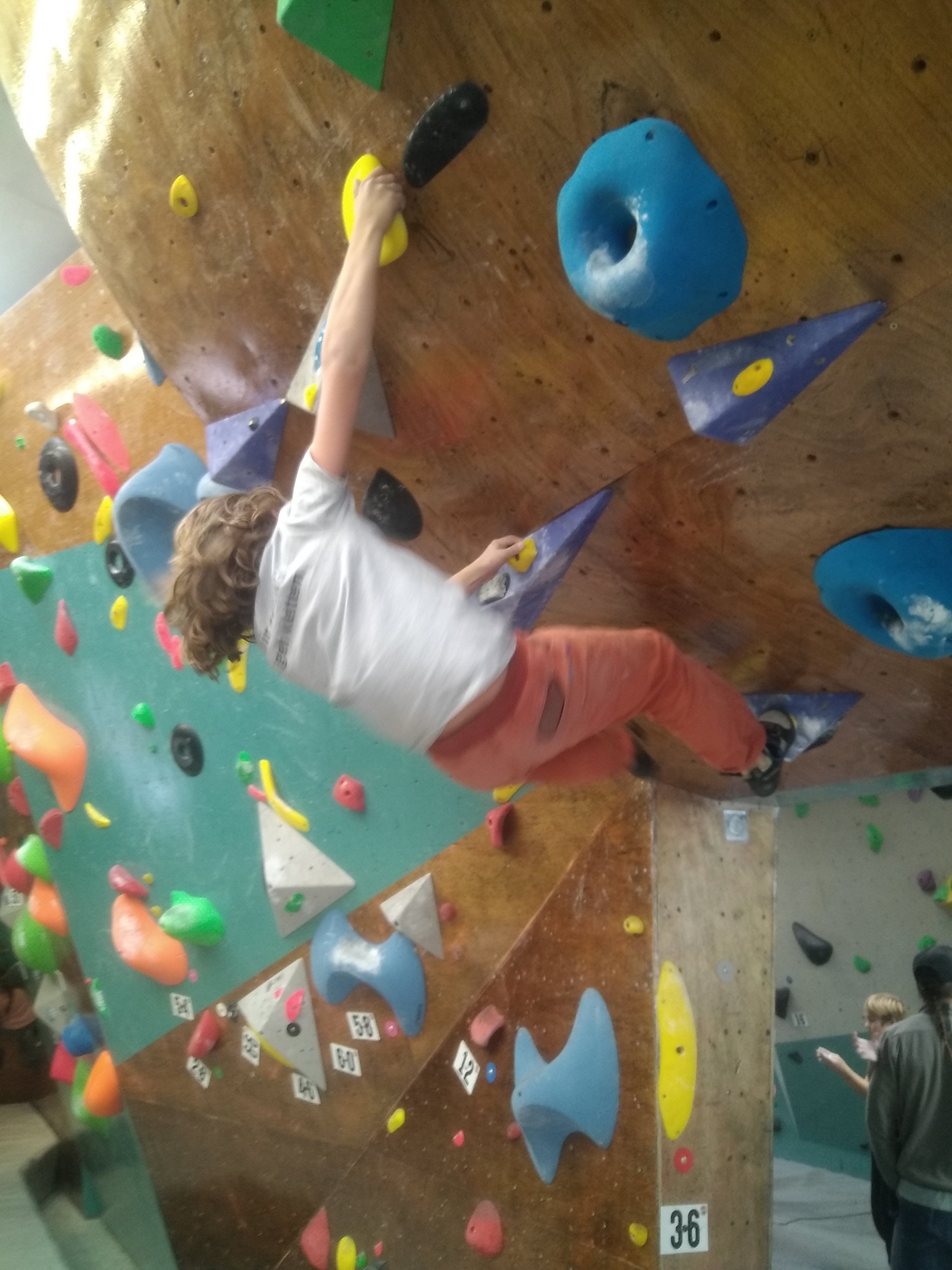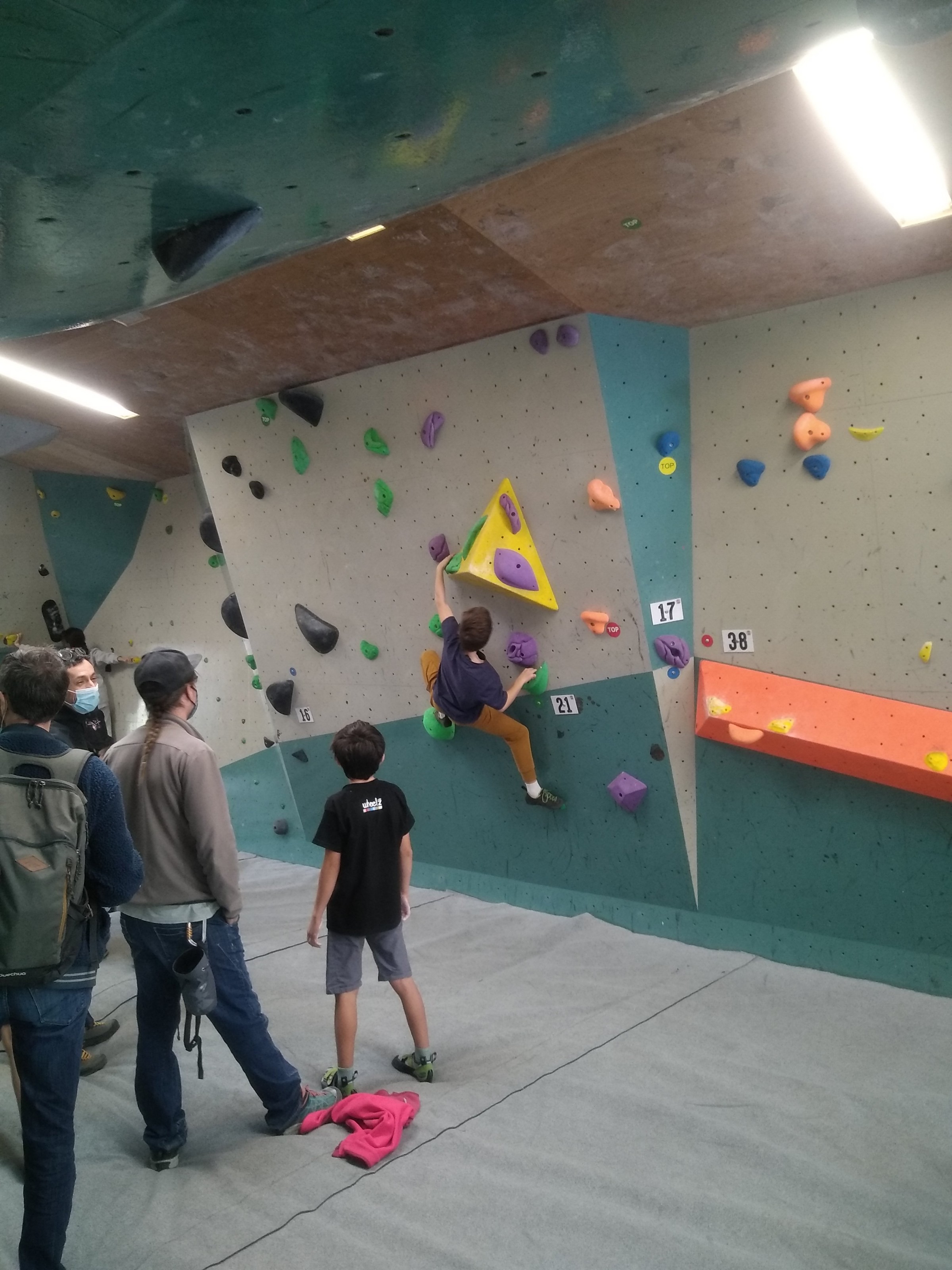 Je suis donc arrivé vers 8h45 à la salle pour accueillir les plus petits dans un froid bien local. Très vite, nous nous sommes rendus compte que ça allait être une vague difficile (pas de mauvais jeu de mot). J’ai entendu parler de 75 enfants. Il a donc fallu réunir tout le monde, trouver des parents pour juger, expliquer aux autres qu’il ne fallait pas rester dans la salle, finaliser les inscriptions, corriger les fiches qui n’ont pas été imprimées en assez grand nombre… C’était un peu la pagaille en tout début de contest mais ça s’est réorganisé. Une fois surtout que les petits ont compris le principe de la compétition, repéré les blocs et les juges. Pas facile à cet âge-là !