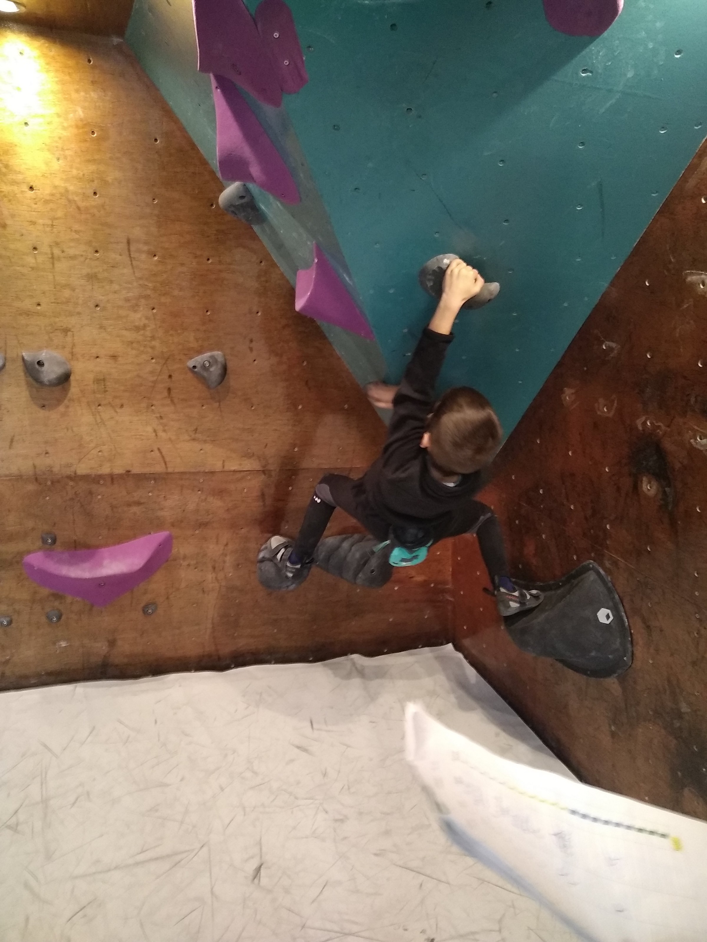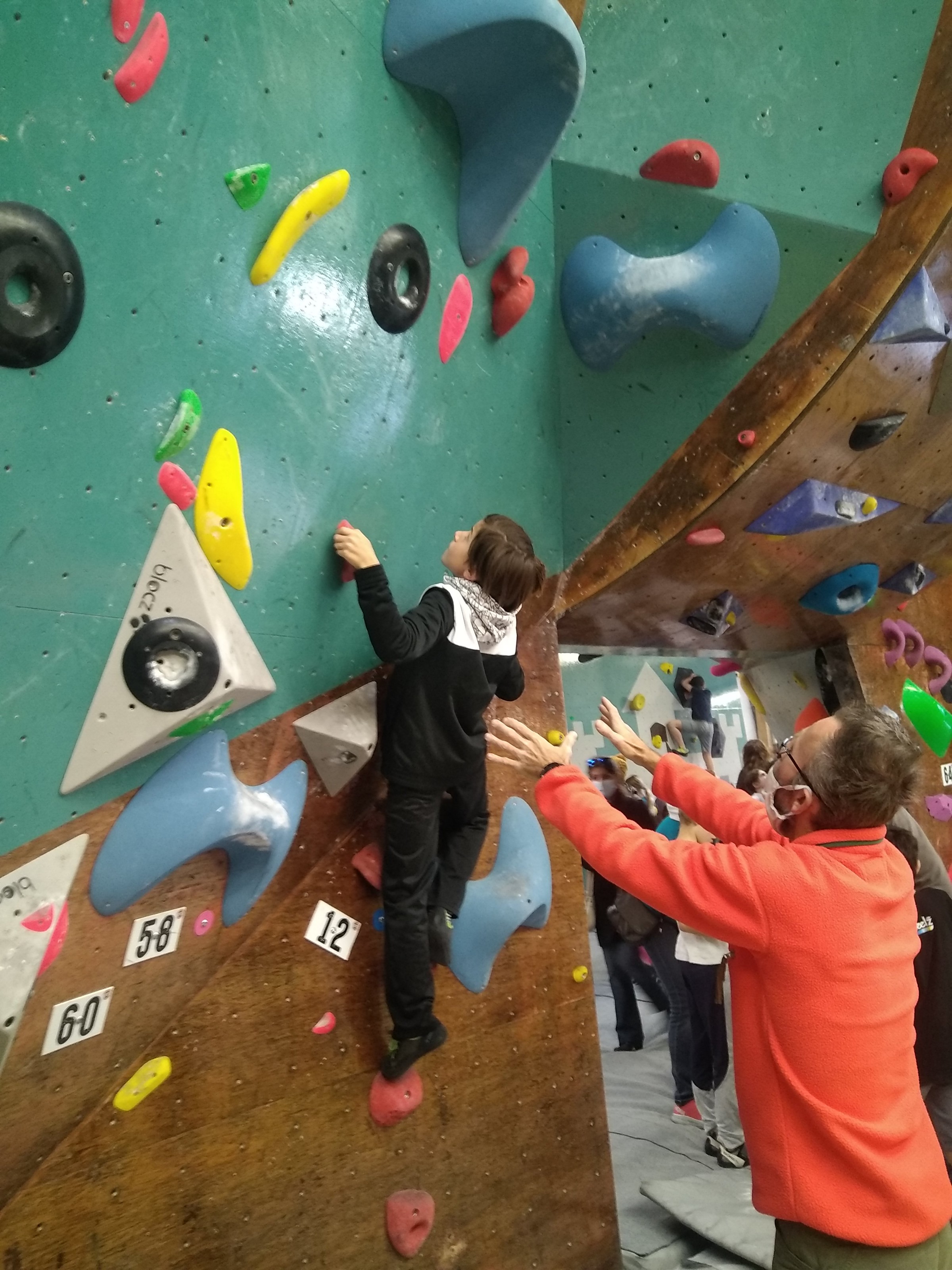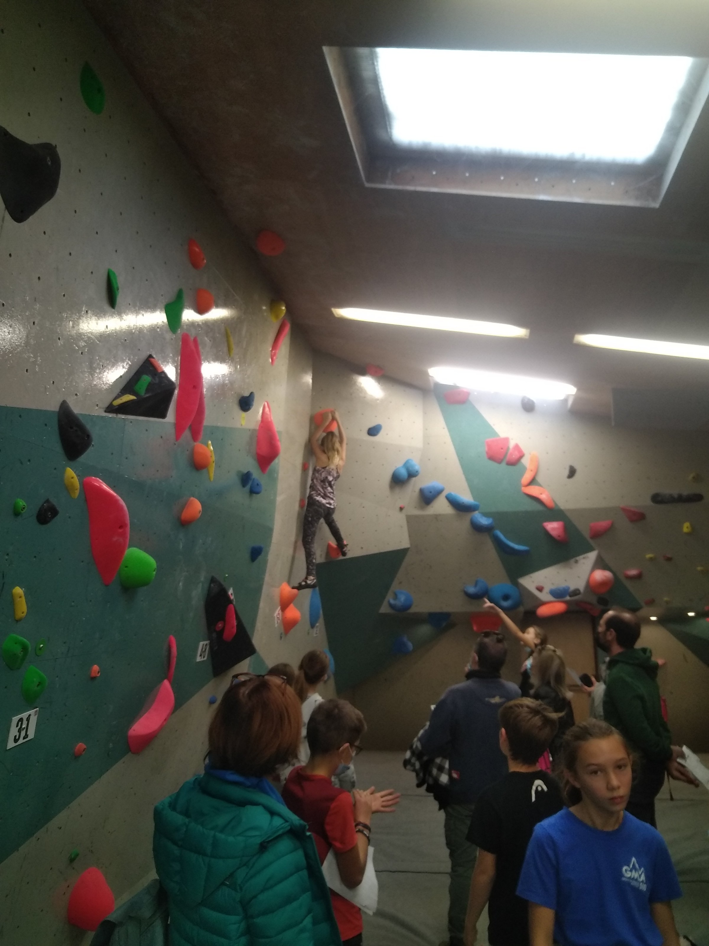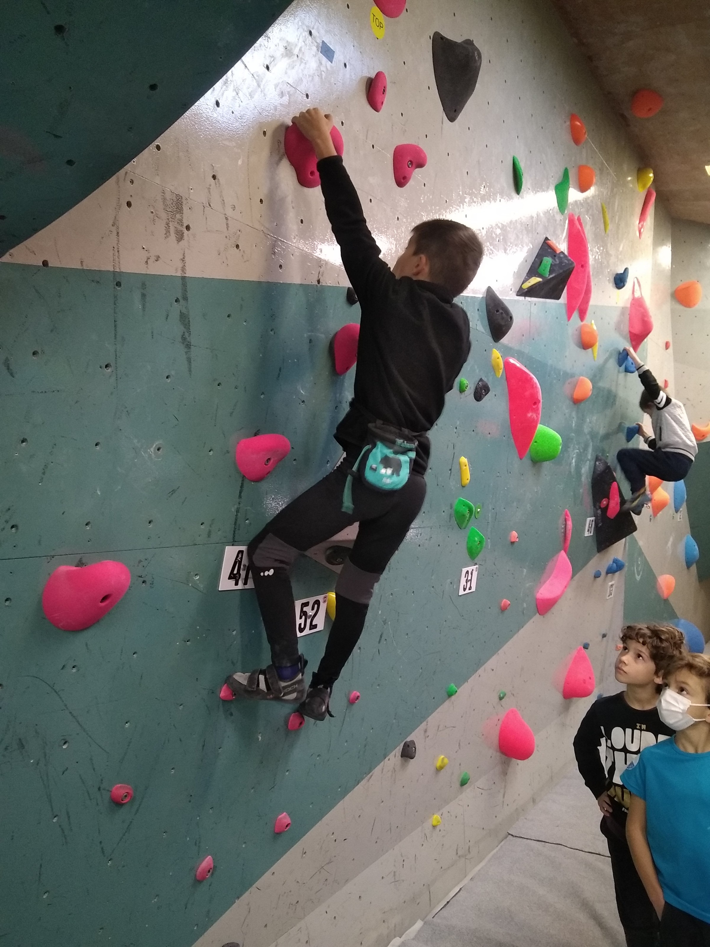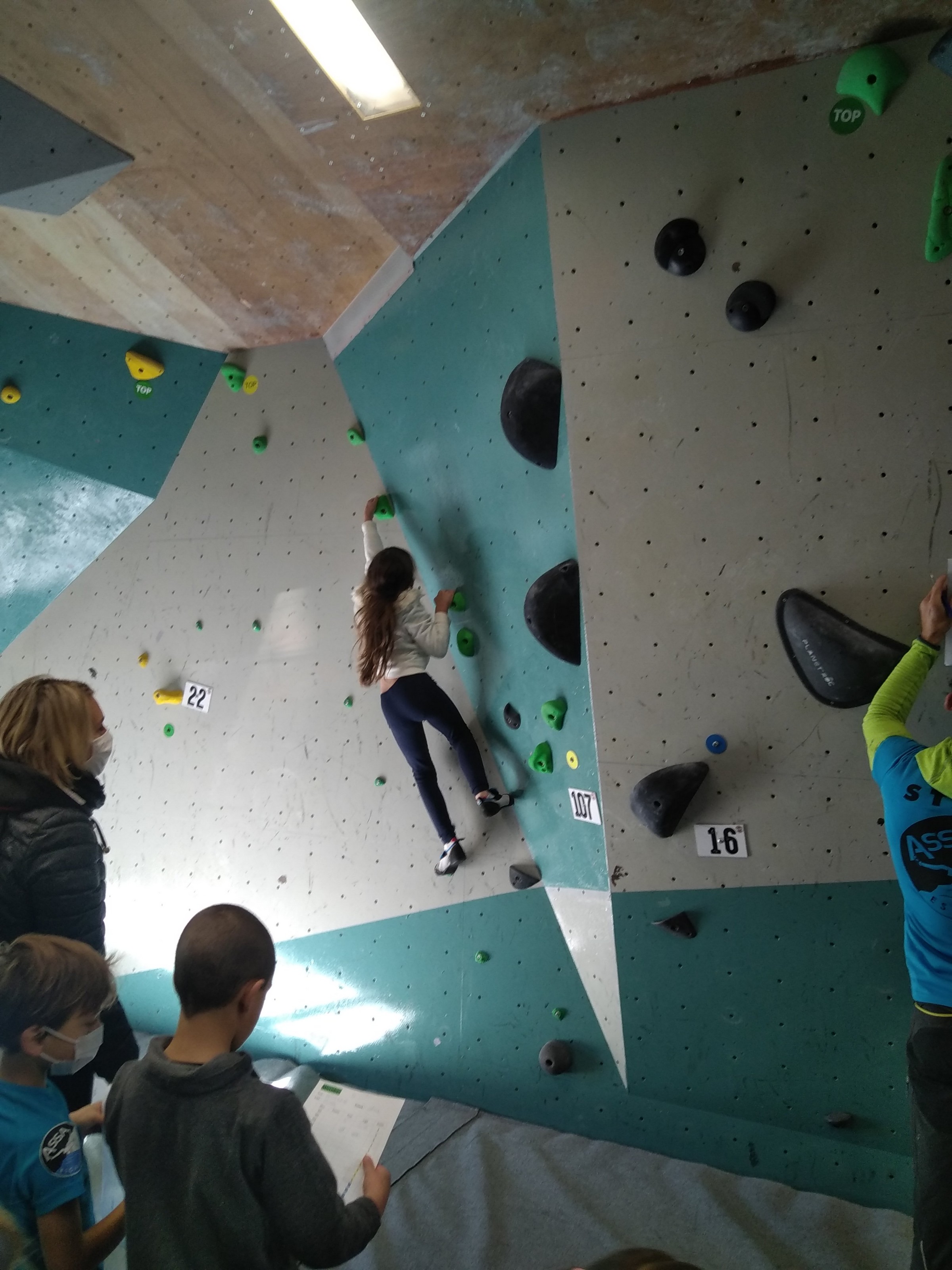 Je suis donc arrivé vers 8h45 à la salle pour accueillir les plus petits dans un froid bien local. Très vite, nous nous sommes rendus compte que ça allait être une vague difficile (pas de mauvais jeu de mot). J’ai entendu parler de 75 enfants. Il a donc fallu réunir tout le monde, trouver des parents pour juger, expliquer aux autres qu’il ne fallait pas rester dans la salle, finaliser les inscriptions, corriger les fiches qui n’ont pas été imprimées en assez grand nombre… C’était un peu la pagaille en tout début de contest mais ça s’est réorganisé. Une fois surtout que les petits ont compris le principe de la compétition, repéré les blocs et les juges. Pas facile à cet âge-là !
