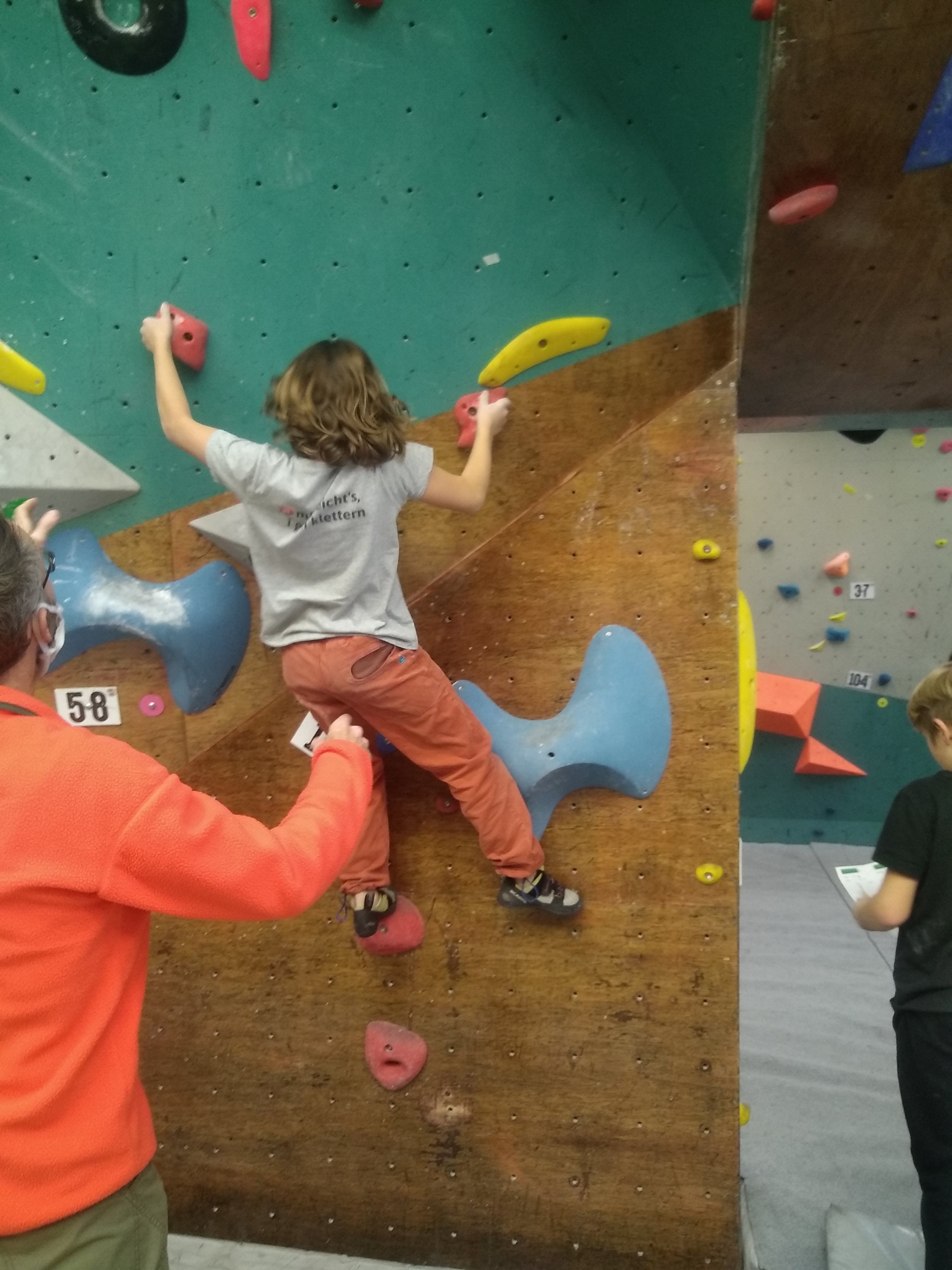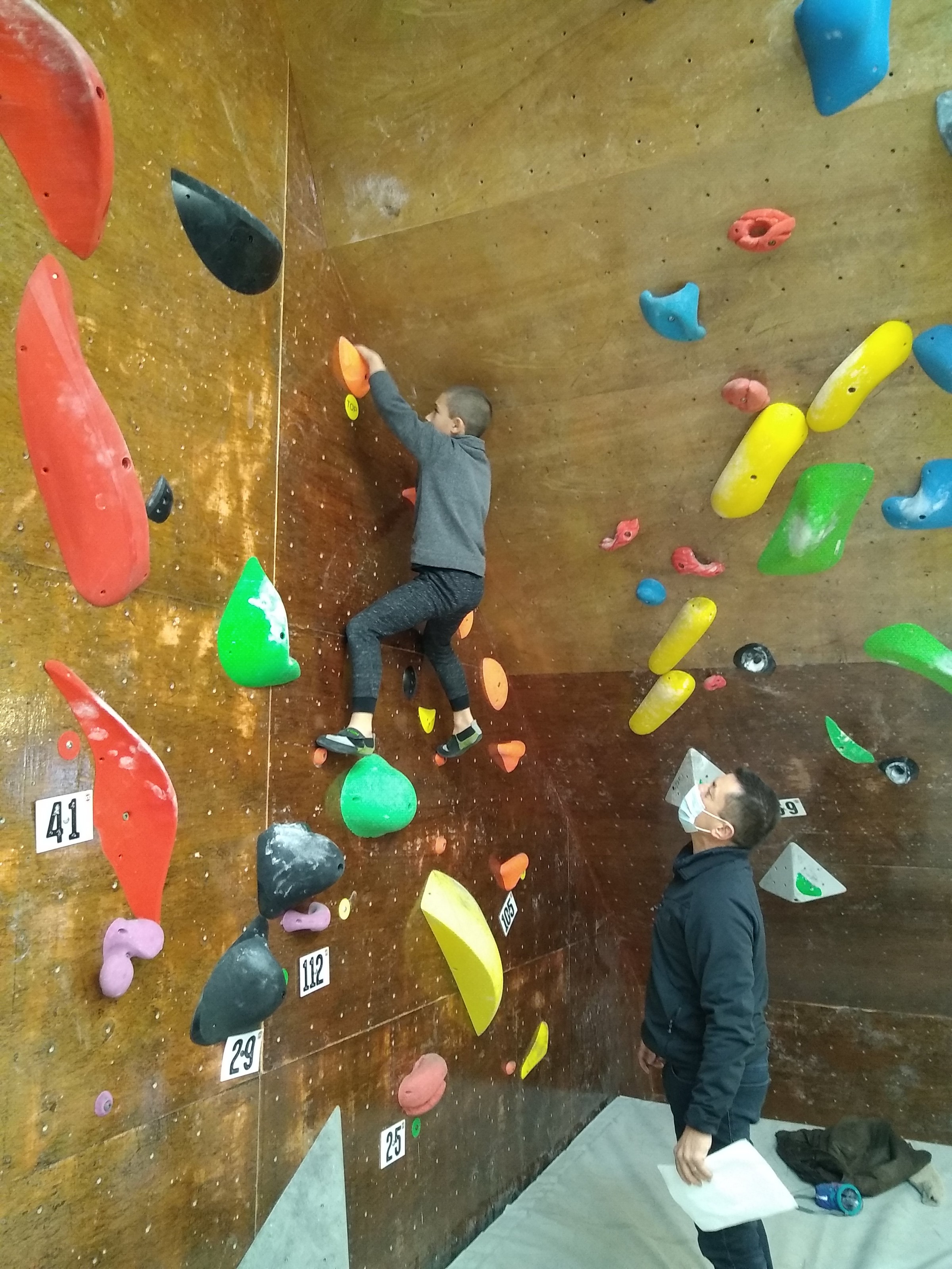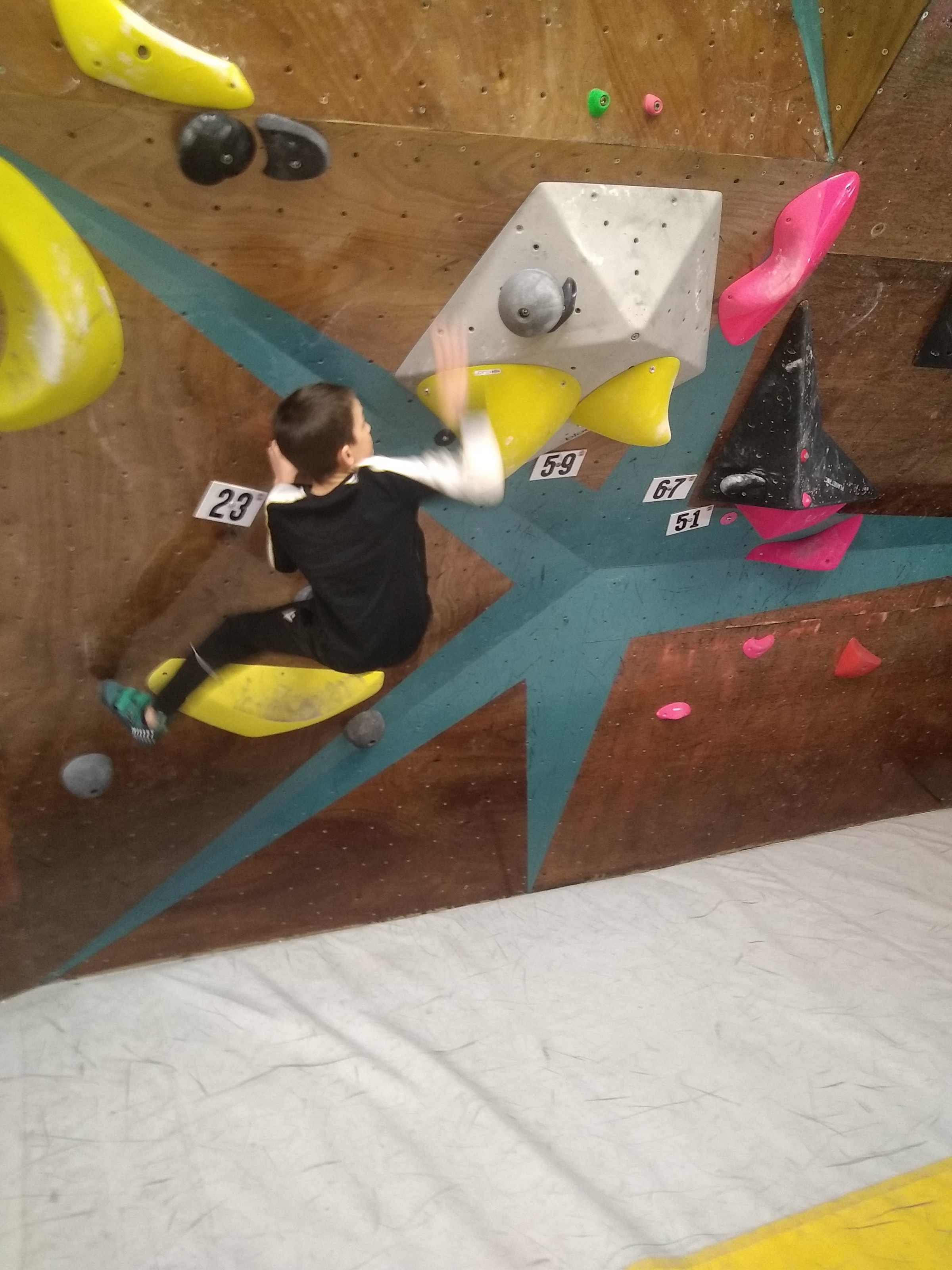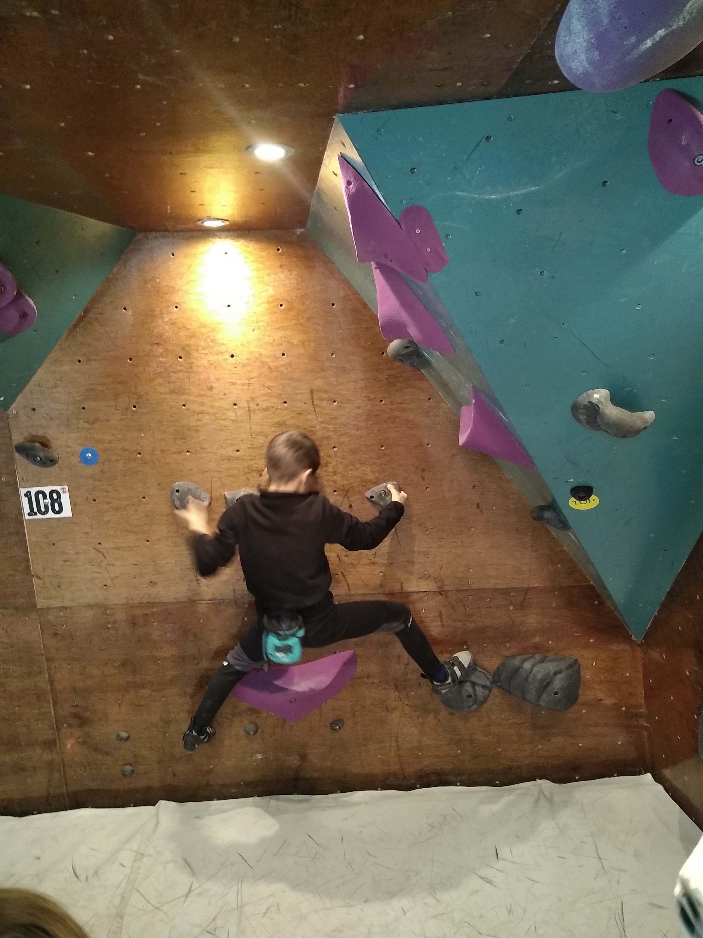 Je suis donc arrivé vers 8h45 à la salle pour accueillir les plus petits dans un froid bien local. Très vite, nous nous sommes rendus compte que ça allait être une vague difficile (pas de mauvais jeu de mot). J’ai entendu parler de 75 enfants. Il a donc fallu réunir tout le monde, trouver des parents pour juger, expliquer aux autres qu’il ne fallait pas rester dans la salle, finaliser les inscriptions, corriger les fiches qui n’ont pas été imprimées en assez grand nombre… C’était un peu la pagaille en tout début de contest mais ça s’est réorganisé. Une fois surtout que les petits ont compris le principe de la compétition, repéré les blocs et les juges. Pas facile à cet âge-là !