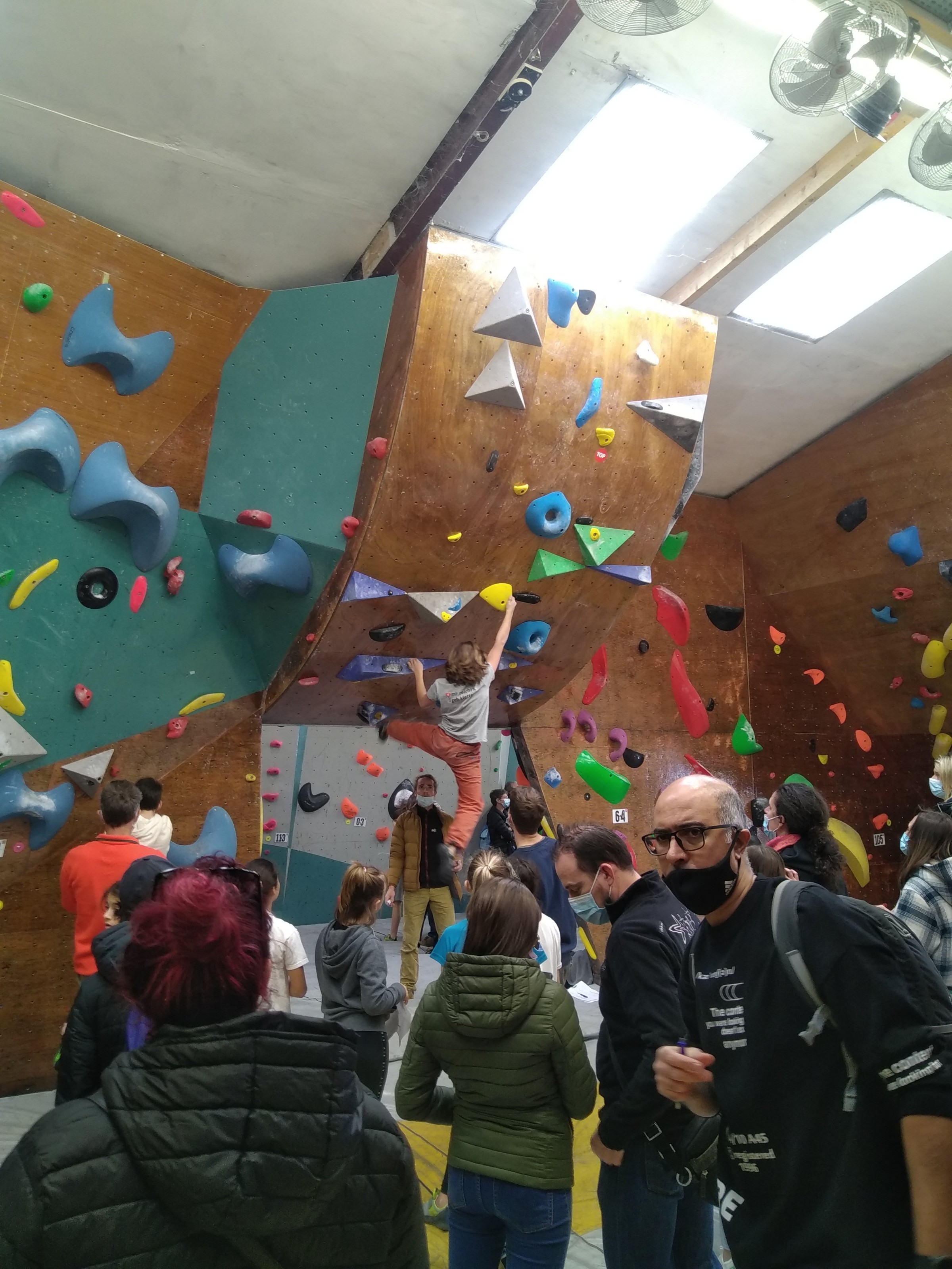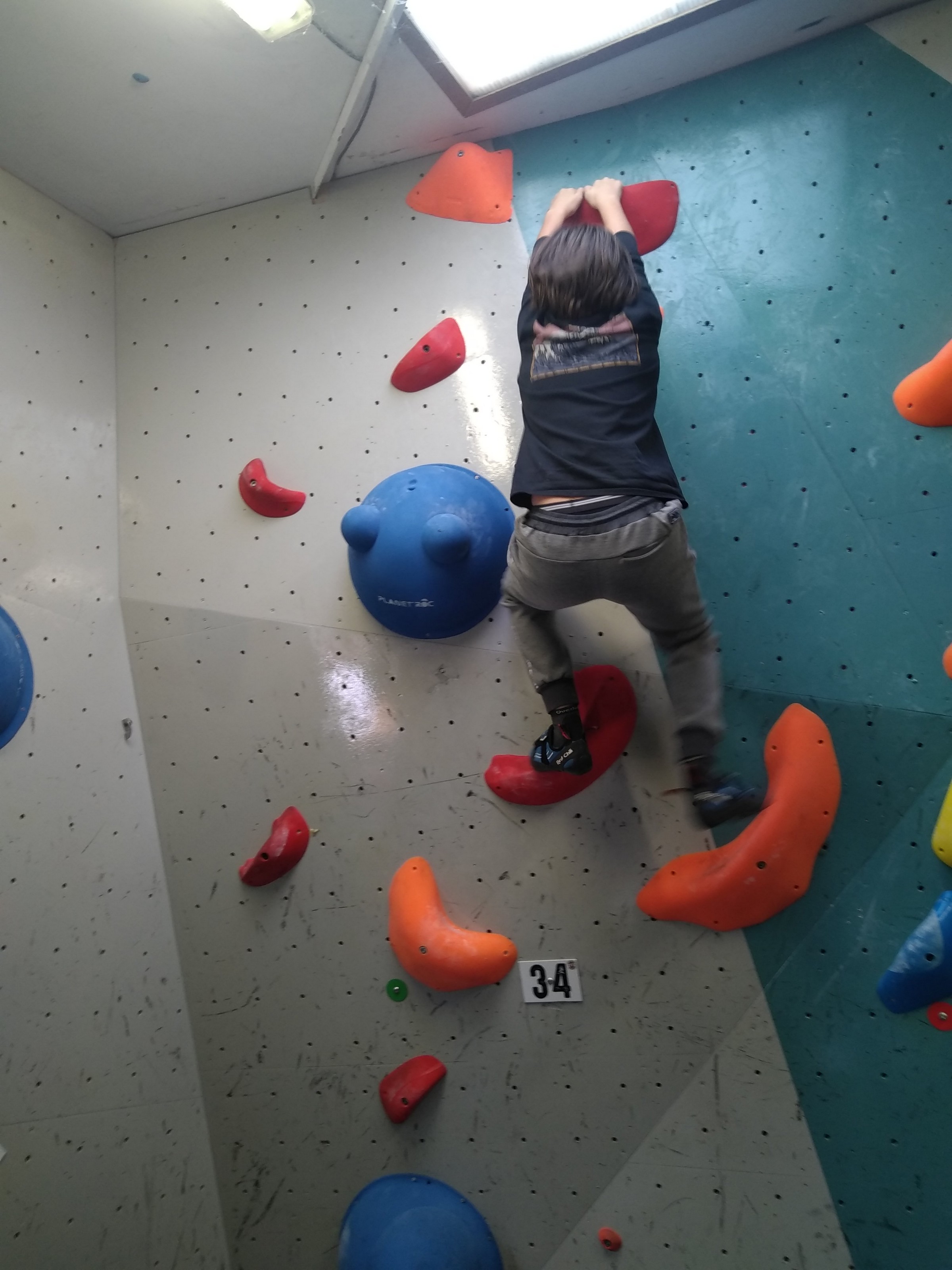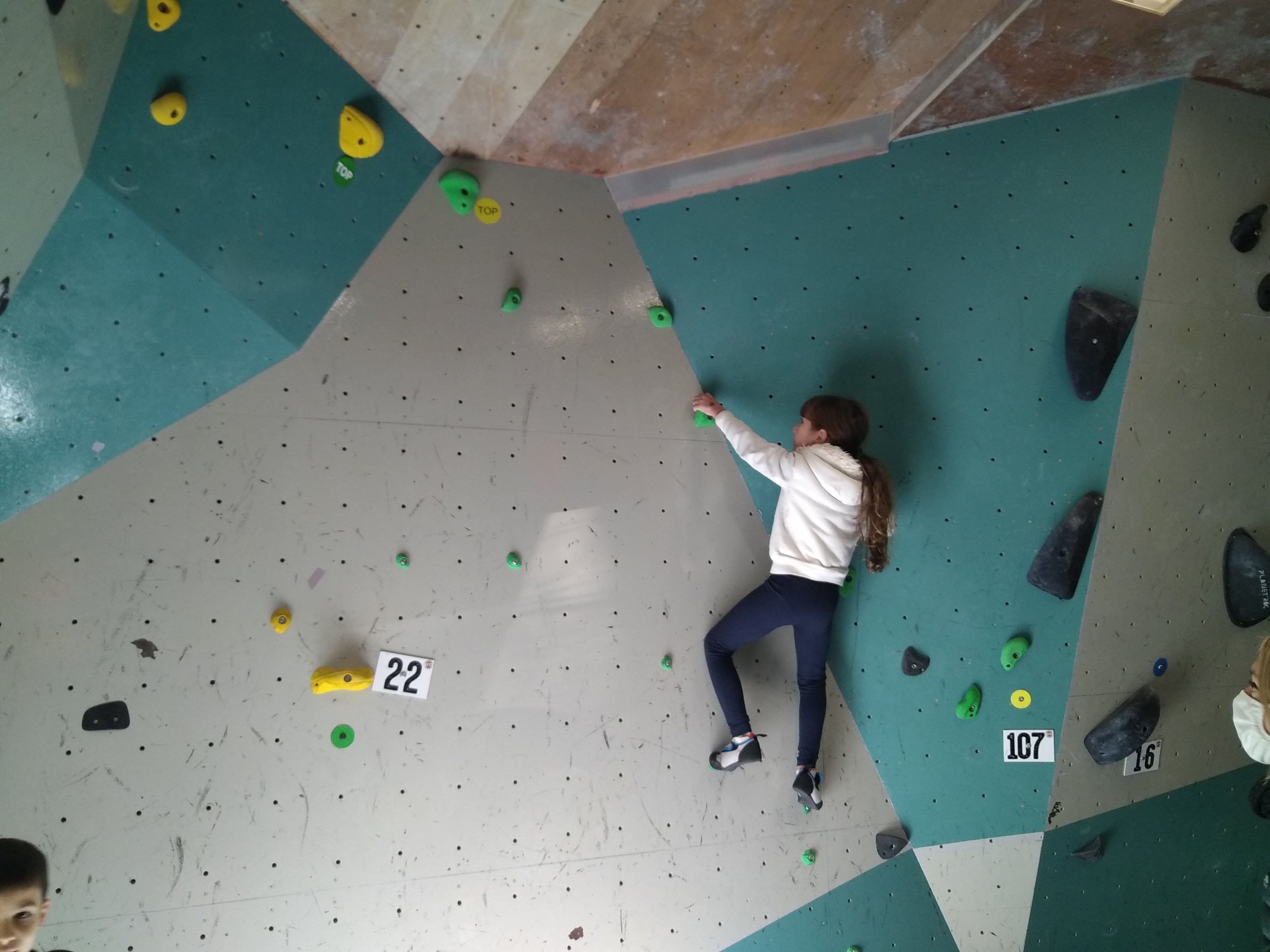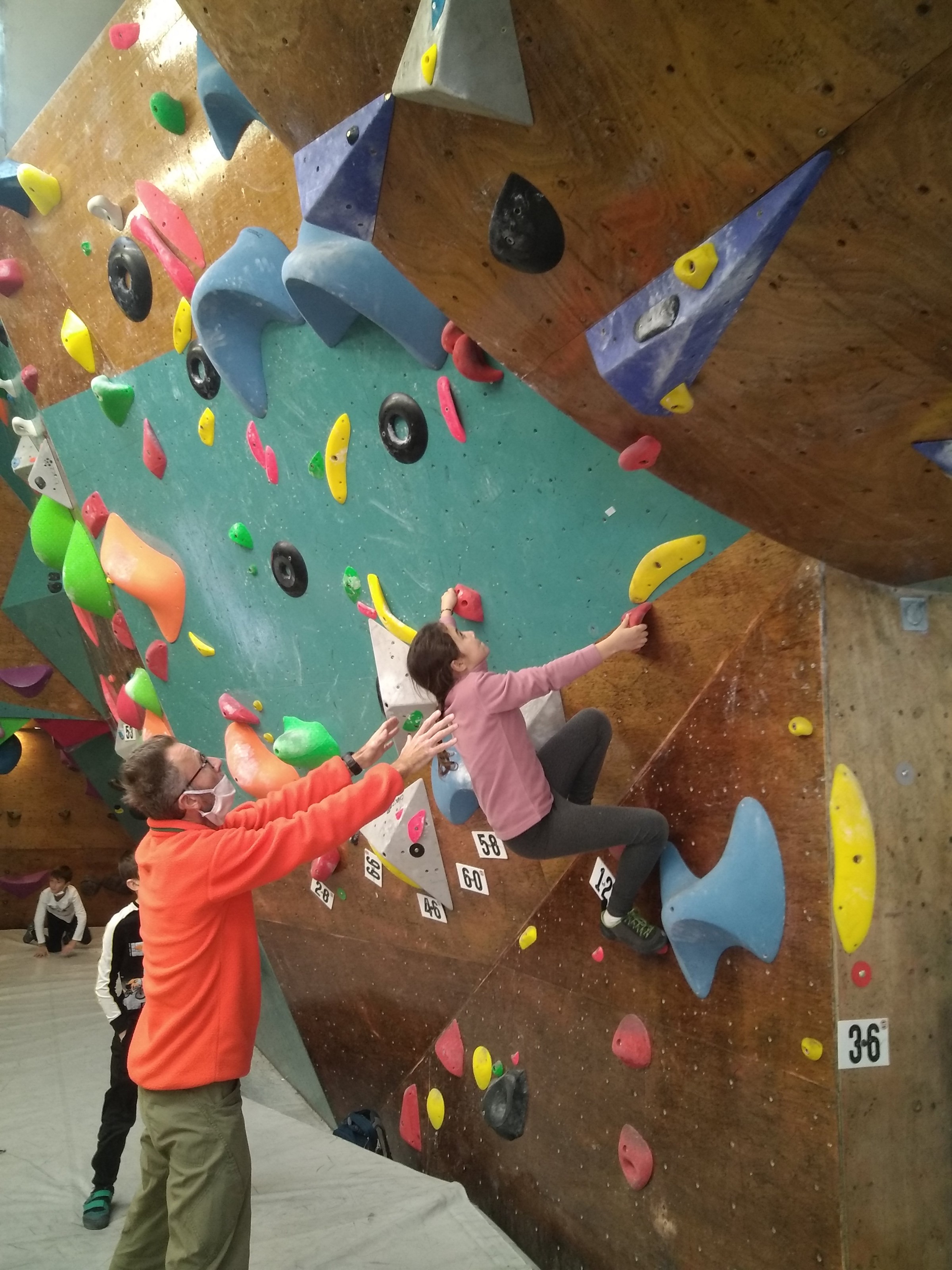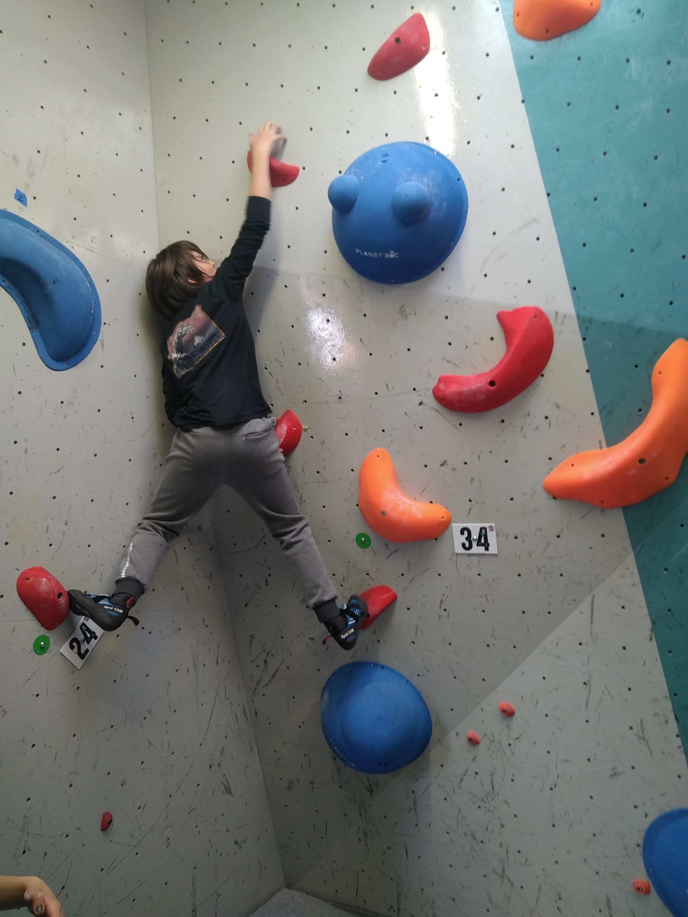 Je suis donc arrivé vers 8h45 à la salle pour accueillir les plus petits dans un froid bien local. Très vite, nous nous sommes rendus compte que ça allait être une vague difficile (pas de mauvais jeu de mot). J’ai entendu parler de 75 enfants. Il a donc fallu réunir tout le monde, trouver des parents pour juger, expliquer aux autres qu’il ne fallait pas rester dans la salle, finaliser les inscriptions, corriger les fiches qui n’ont pas été imprimées en assez grand nombre… C’était un peu la pagaille en tout début de contest mais ça s’est réorganisé. Une fois surtout que les petits ont compris le principe de la compétition, repéré les blocs et les juges. Pas facile à cet âge-là !