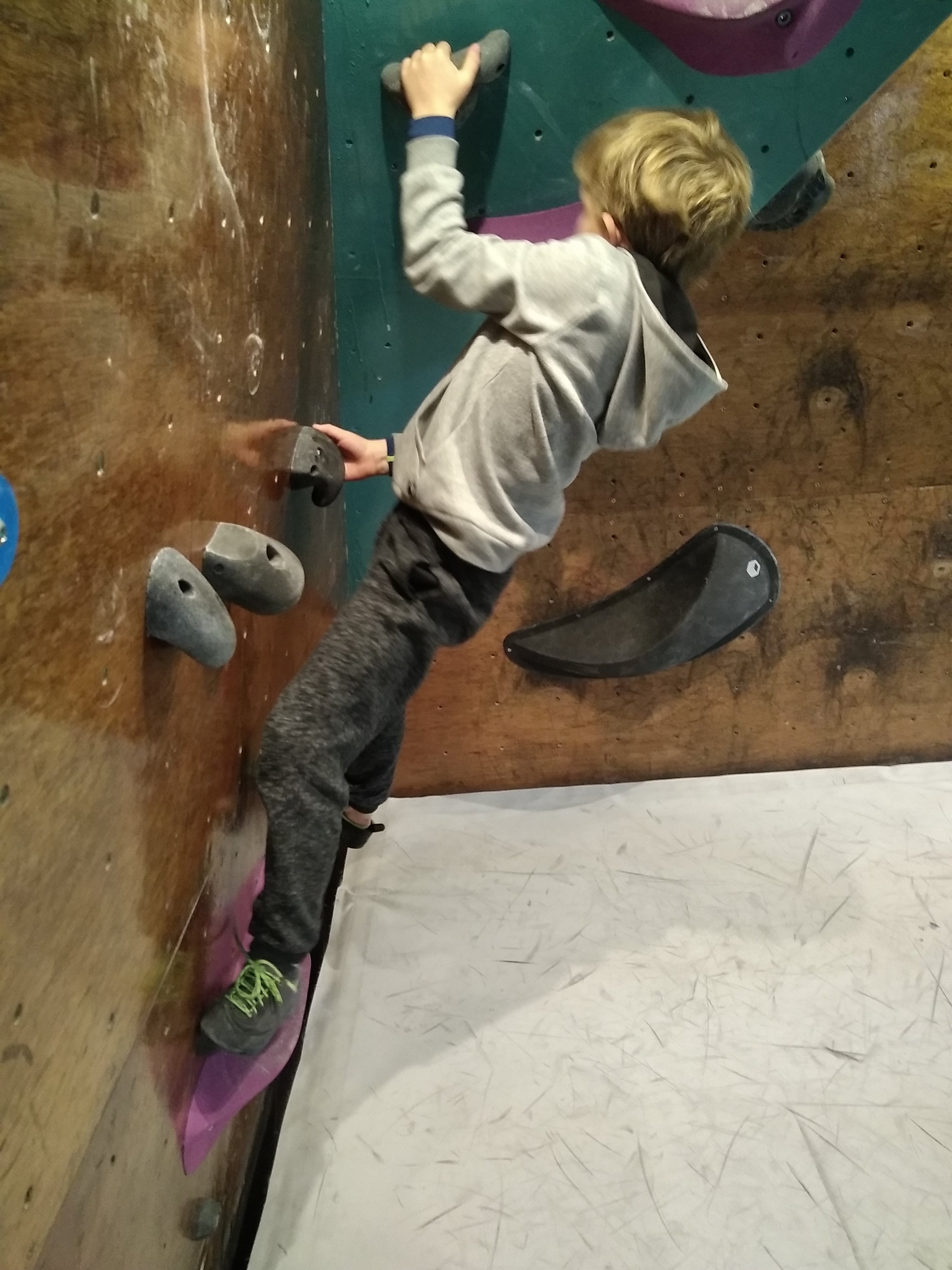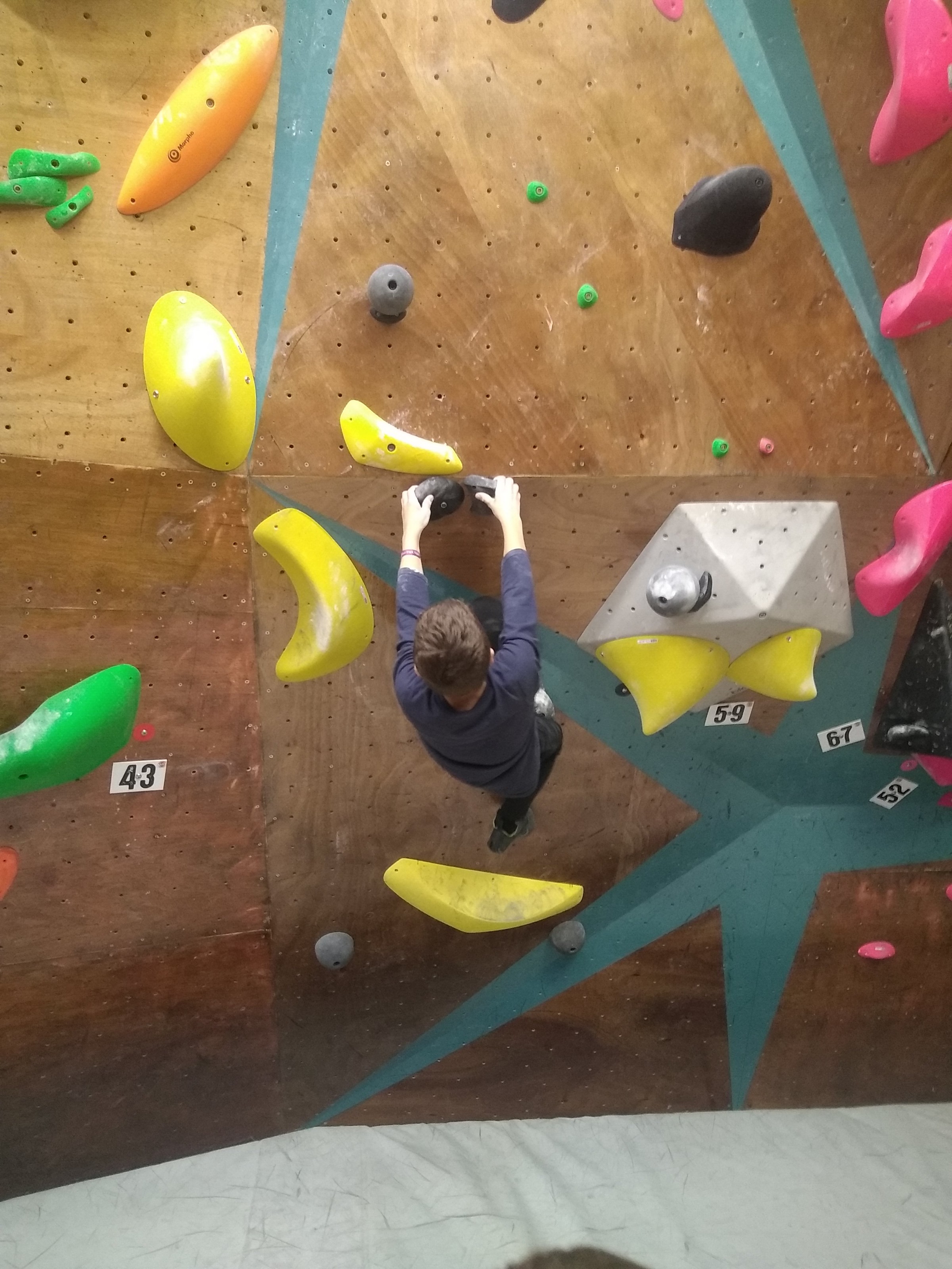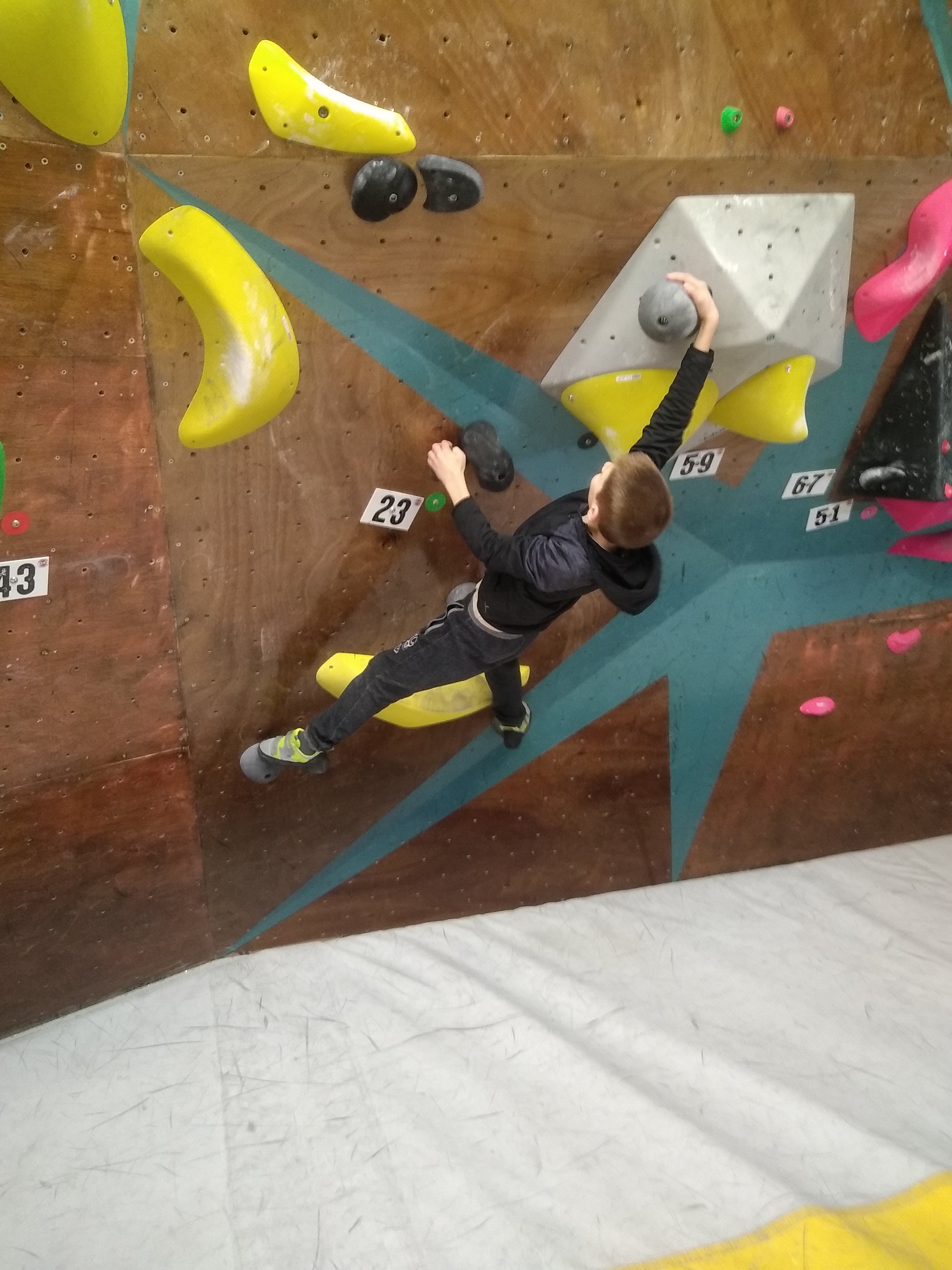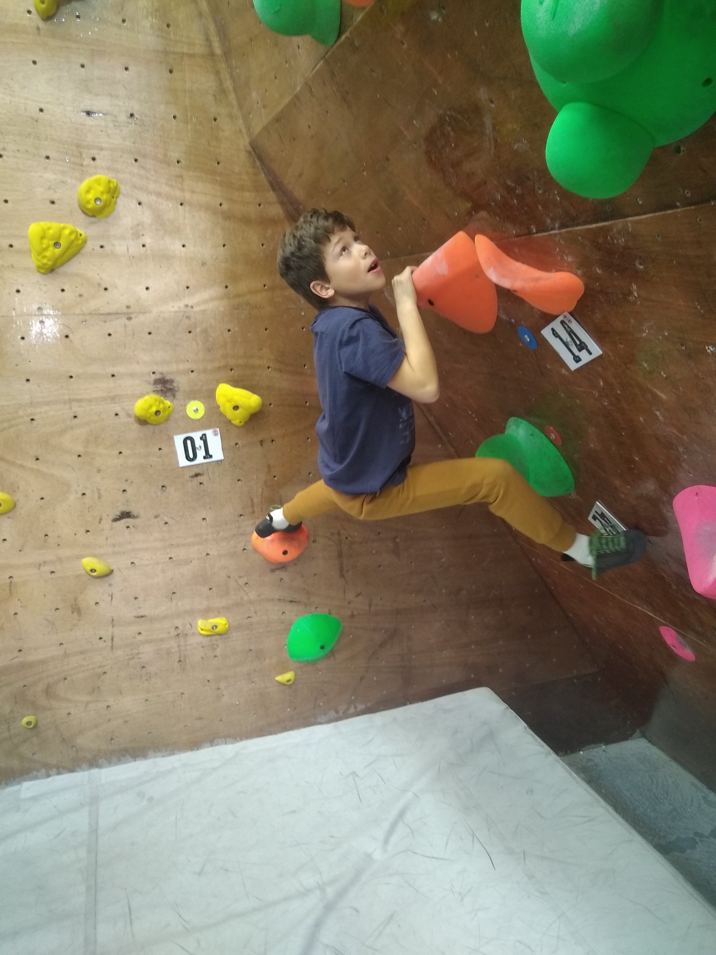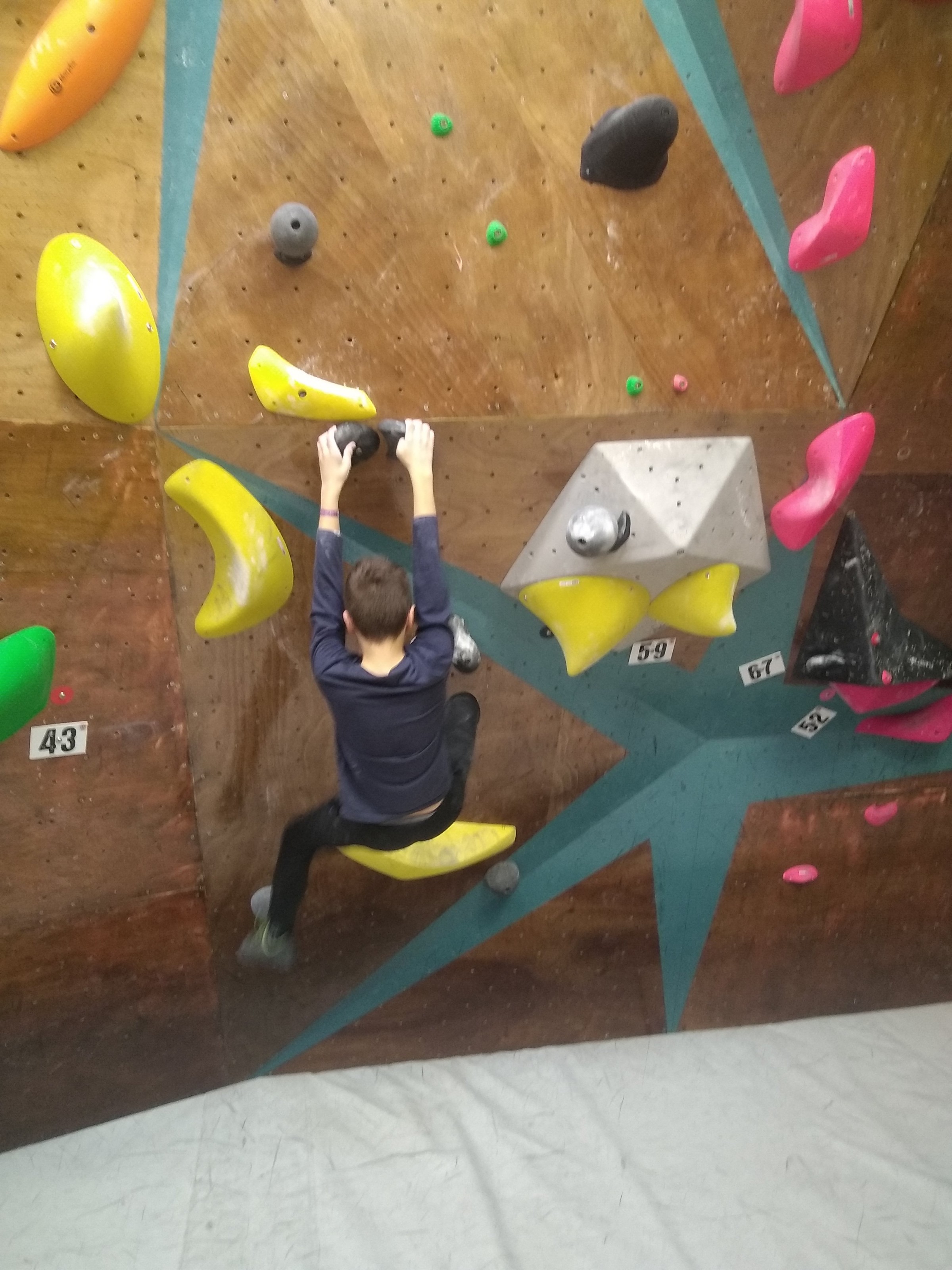 Je suis donc arrivé vers 8h45 à la salle pour accueillir les plus petits dans un froid bien local. Très vite, nous nous sommes rendus compte que ça allait être une vague difficile (pas de mauvais jeu de mot). J’ai entendu parler de 75 enfants. Il a donc fallu réunir tout le monde, trouver des parents pour juger, expliquer aux autres qu’il ne fallait pas rester dans la salle, finaliser les inscriptions, corriger les fiches qui n’ont pas été imprimées en assez grand nombre… C’était un peu la pagaille en tout début de contest mais ça s’est réorganisé. Une fois surtout que les petits ont compris le principe de la compétition, repéré les blocs et les juges. Pas facile à cet âge-là !