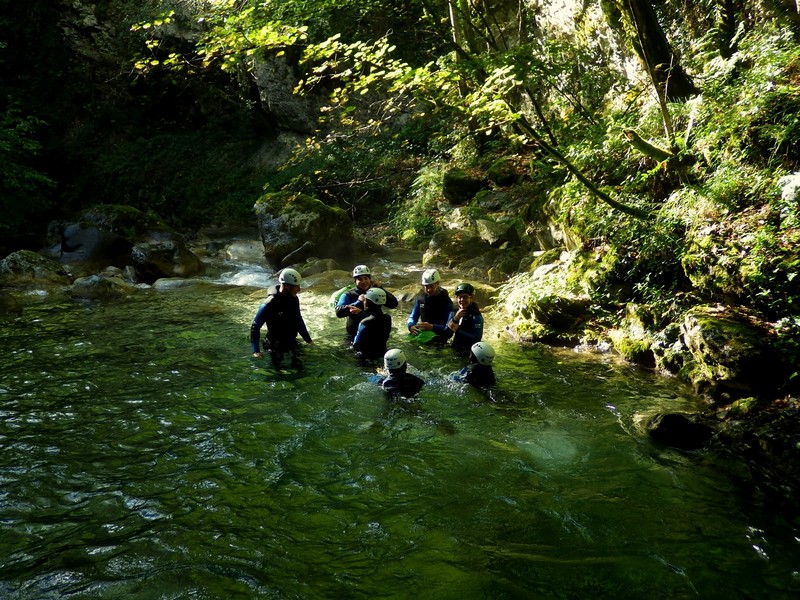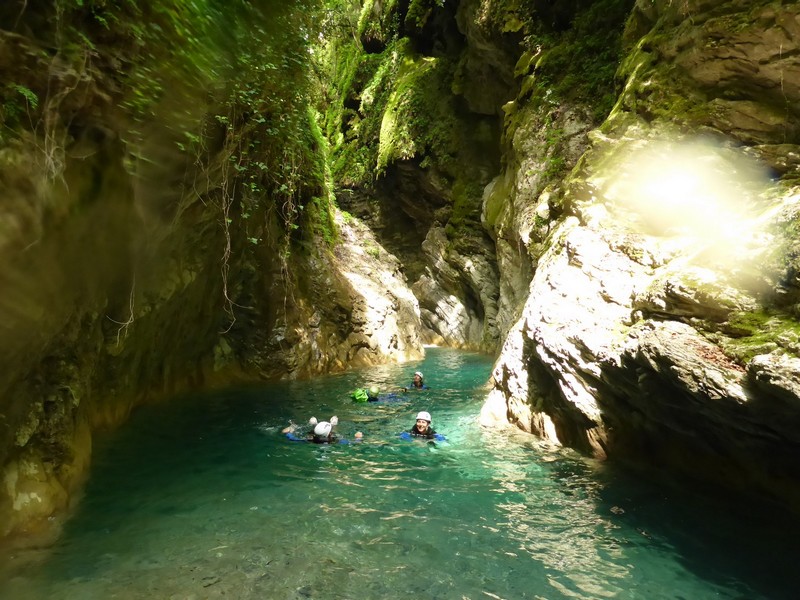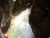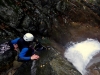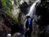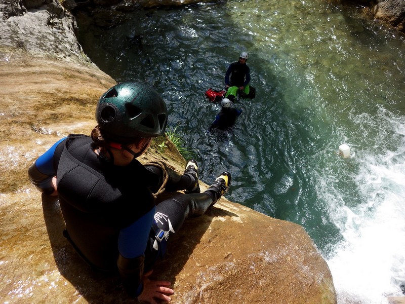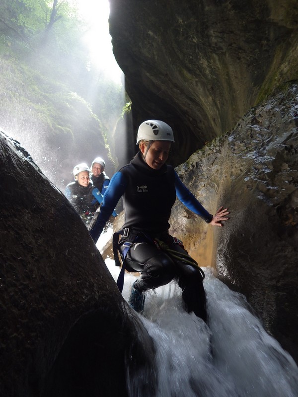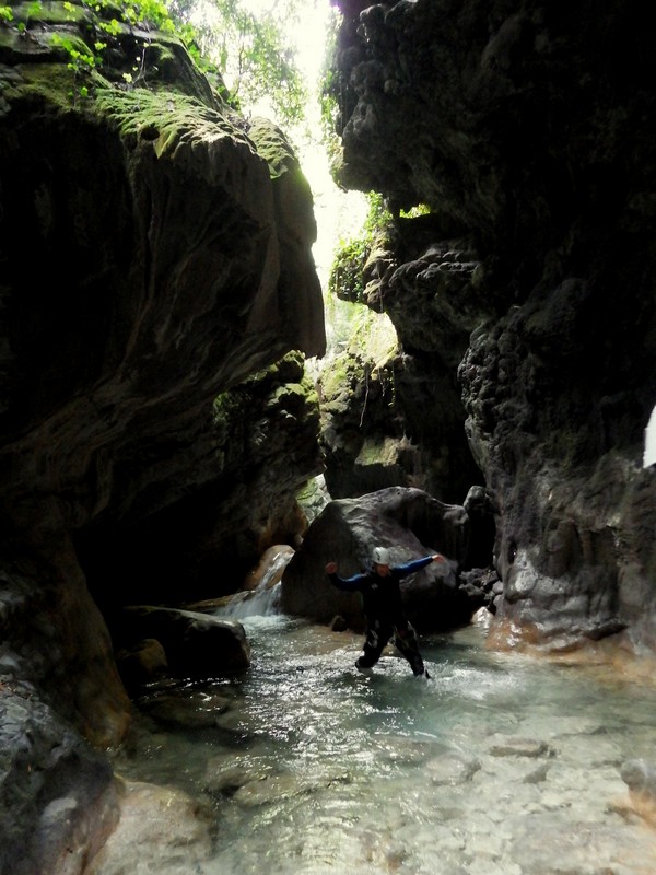 Après quelques minutes de marche sur une piste, nous attaquons la descente vers le fond du vallon qui n’est pas très longue mais se mérite quand même. Elle est raide et aboutit directement là où l’on s’équipe, à quelques enjambées du premier obstacle. Ce premier saut est un peu technique car il faut sauter par dessus une grande avancée rocheuse. Marion préfère la corde, que nous ne sortirons plus très souvent. Ensuite, les obstacles s’enchainent quasiment sans pause. Beaucoup de toboggans de tous les styles. Des raides, des tordus, des grands, des larges, des éjectables. Tout passe, le canyon est très bien équipé et on ne se pose pas de questions. Quelques sauts viennent aussi agrémenter le parcours, dont un beau de 10m dans une belle vasque. Les bassins sont grands, profonds, et même si l’eau est sombre, et le soleil pas franchement présent (orientation plutôt nord), le cadre est bien joli. Le temps de jeu est malheureusement un peu court, car nous sortons de l’eau à peine 1h30 après y être rentrés. Mais quel régal ! De là, il ne reste plus qu’à entreprendre la longue remontée jusqu’à la voiture. Quoiqu’il en soit, un must à faire impérativement si vous trainez dans les parages.