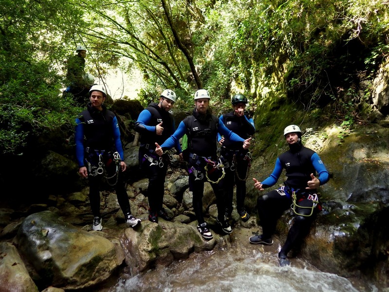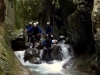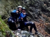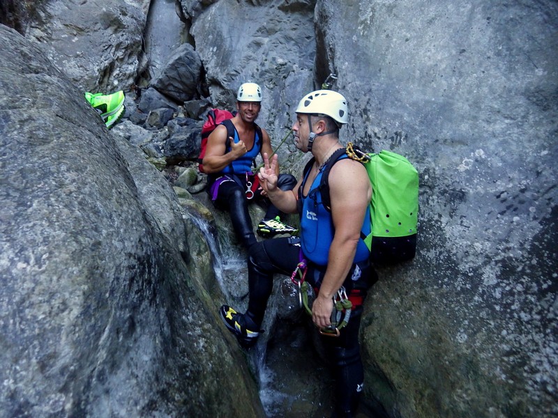 Au troisième matin, nous sommes décidés à calmer un peu le jeu et chercher un beau petit canyon ludique. Notre choix s’oriente vers le gourg des Anelles, affluent du Tech, la vallée plus au sud, presque à la frontière espagnole. Cette fois, les marches ne sont pas épuisantes (la remontée un peu quand même), et le canyon une fois de plus enchanteur. Moins soutenu qu’un Llech, nous découvrons tout plein de belles vasques, sauts et toboggans. Le premier obstacle est le plus grand : 25m. Le dernier le plus fun : toboggan de 12m. En tout cas, un canyon facile, pas trop fatiguant comme on en recherchait. Superbe !