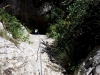Le soir même, nous dormons au col de Jou, à quelques kilomètres à peine de là. Après analyse des topos, et comme nous n’avons qu’un seul véhicule, nous décidons d’attaquer la marche d’approche du Cady de ce point de départ. Direction donc le col du cheval mort au petit matin, en à peu près une heure, en compagnie d’un club de randonnée pour 3ème âge fort joyeux et assez utile dans la mesure où nous n’avons pas de carte. Une demi-heure après le col, nous voilà à la passerelle enjambant la rivière. L’orage de la veille nous a apporté un débit pas franchement débonnaire mais loin d’être dangereux quand même. Alors nous nous engageons dans ce long canyon beaucoup plus sportif et aventureux que la veille. Ici, l’équipement est minimaliste et pas toujours optimisé. La vallon est beaucoup moins encaissé et très glissant. Par contre, le caractère sauvage est très présent : on se sent (et on est) loin de tout ! Il nous aura fallu 4h30 pour terminer la descente, évitant souvent l’actif par des mains courantes peu évidentes. Si le canyon offre sûrement de nombreux sauts, nous n’avons pu en essayer aucun car les vasques sont toutes trop sombres et à deux, l’utilité d’aller sonder n’est pas vraiment fondée. Quelques belles cascades et toboggans ponctuent cette aventure à réserver à des équipes sportives. Car au bout du canyon, il reste encore 1h30 de marche pour revenir à la route ! Et un bon footing pour aller récupérer la voiture. Grosse journée !